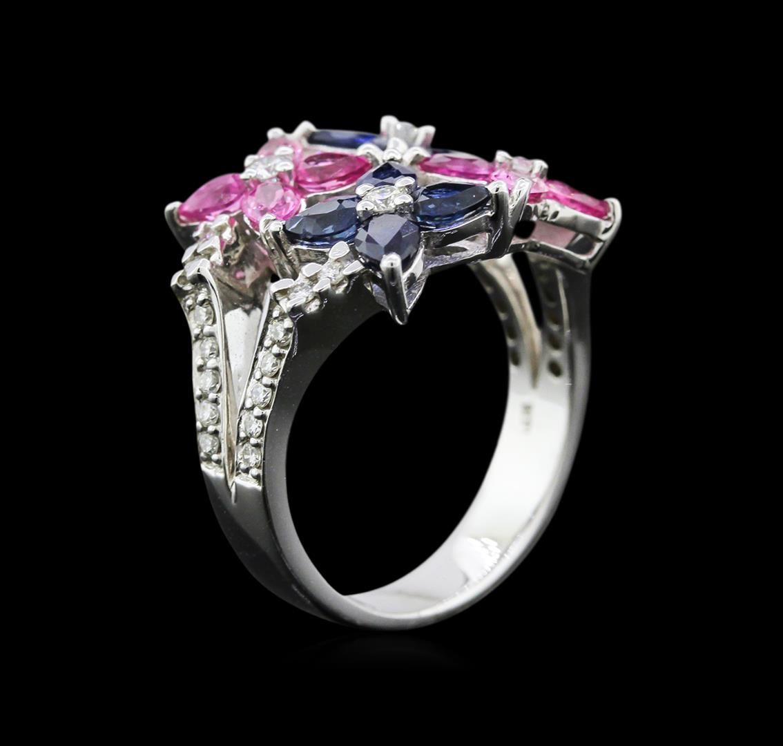 One ring featuring: 14KT white gold weighing 7.90 grams containing prong set pear shape blue and pink sapphires with a total weight of 1.50ct and prong and pave set round diamonds with a total weight of 0.40ct.
