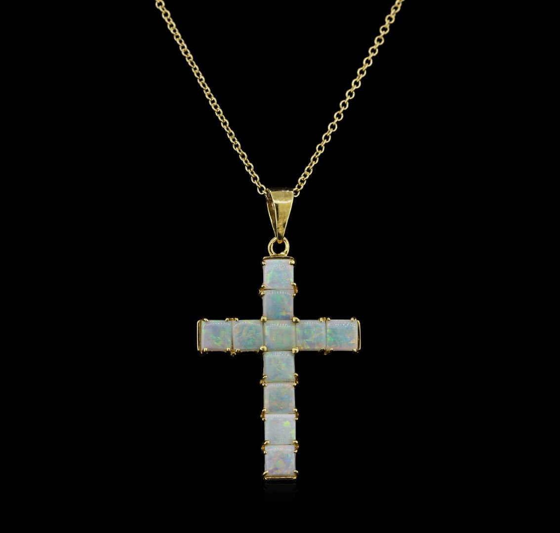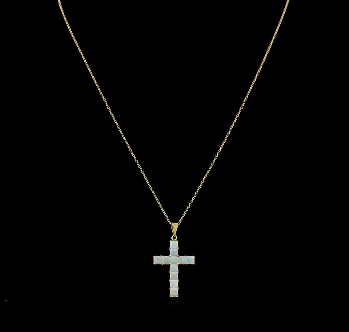 One cross pendant with chain featuring: 14KT yellow gold weighing 1.94 grams containing 11 prong set princess cut opals with a total weight of 1.50ct.