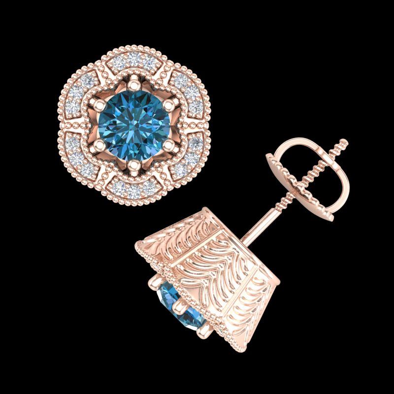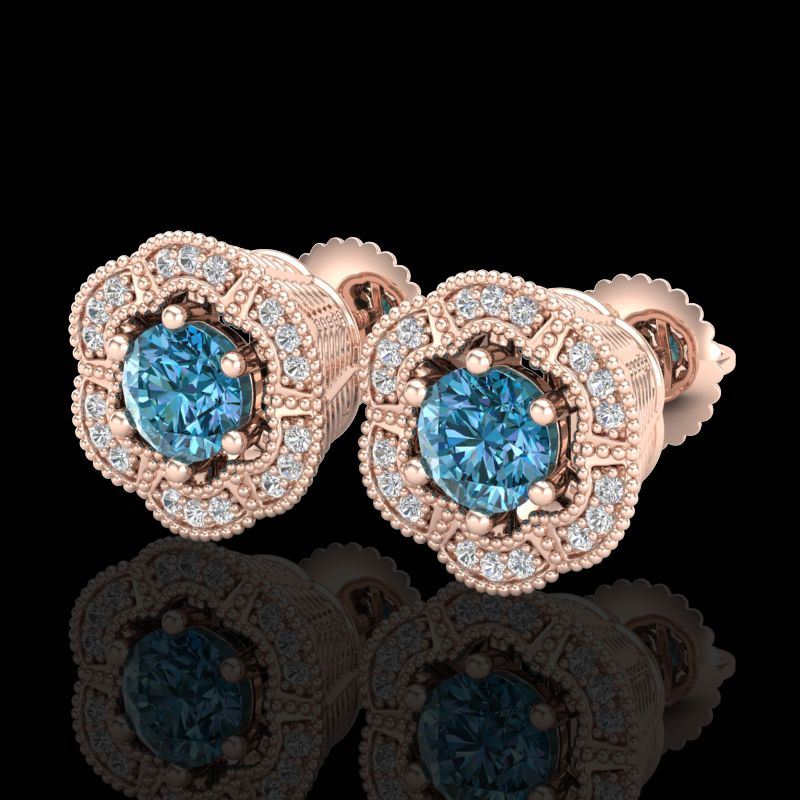 1.51 CTW Fancy Intense Blue Diamond Art Deco Stud Earrings 18K Rose Gold ---- Luxury Designer Brand Earring Appraised Retail Price at $10,800 ---- SKU Number US37965 18k Rose gold Earring Size is Larger, Earring measuring approx. Uniform, weighing in total approx. 5.4 grams. Made in the USA and is stamped 18k, Main stone 1.2 carat total weight containing 2 pieces of Intense Fancy Blue color with SI quality Round shape cut Diamond , Stone #2 0.31 carat total weight containing 36 pieces of H-I color with VS/SI quality Round shape cut