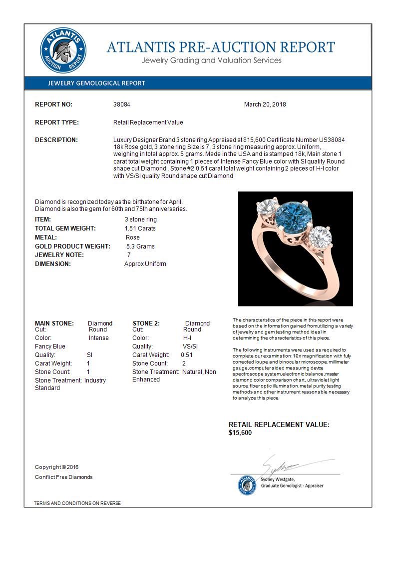 REF-236M4H -38084 ---- 1.51 CTW Intense Blue Diamond Solitaire Art Deco 3 Stone Ring 18K Rose Gold ---- Luxury Designer Brand 3 stone ring Appraised at $15,600 Certificate Number US38084 18k Rose gold, 3 stone ring Size is 7, 3 stone ring measuring approx. Uniform, weighing in total approx. 5 grams. Made in the USA and is stamped 18k, Main stone 1 carat total weight containing 1 pieces of Intense Fancy Blue color with SI quality Round shape cut Diamond , Stone #2 0.51 carat total weight containing 2 pieces of H-I color with VS/SI quality Round shape cut Diamond