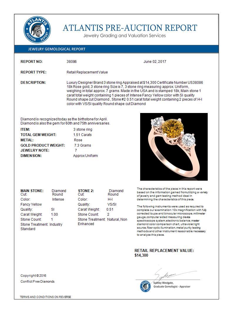 1.51 CTW Intense Fancy Yellow Diamond Art Deco 3 Stone Ring 18K Rose Gold ---- Luxury Designer Brand 3 stone ring Appraised Retail Price at $14,300 ---- SKU Number US38086 18k Rose gold 3 stone ring Size is 7, 3 stone ring measuring approx. Uniform, weighing in total approx. 7 grams. Made in the USA and is stamped 18k, Main stone 1.00 carat total weight containing 1 pieces of Intense Fancy Yellow color with SI quality Round shape cut Diamond , Stone #2 0.51 carat total weight containing 2 pieces of H-I color with VS/SI quality Round shape cut