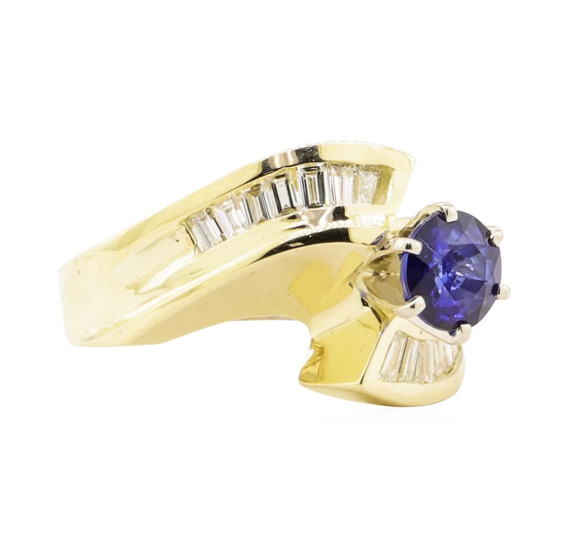 One electronically tested 14KT yellow gold lady's combination cast & assembled fashion ring with a bypass cathedral shank with a bright polish finish. The featured lady's ring has a shank measuring 3.50 millimeters wide. Condition is like new, good workmanship. Containing: One prong set round modified mixed cut natural blue sapphire, measuring 5.85 - 5.82 x 3.70 mm, (depth est.) approximate weight of 1.01ct., clarity is slightly included, medium dark, moderately strong, blue color, (GIA B 6/4), cut is good. Transmitting light with a minimum of distortion, transparent. Colored gemstones are presumed to have been subjected to commonly used enhancement processes. Graded in the setting. Fourteen channel set baguette cut (tapered) diamonds, measuring from 1.90 x 1.30 x 1.11mm (depth est.) to 2.60 x 1.50 x 1.28mm (depth est.) approximate total weight of 14 Stones = 0.50 ct. Graded in the setting. Color H - I Clarity VS-1 to VS-2 Cut Very Good. Total Weight of Colored Stones 1.01ct.. Total Weight of Diamonds 0.50 ct.. Total Weight of Ring 7.00gm GAS Appraised at $3630.00. GAS Appraised.