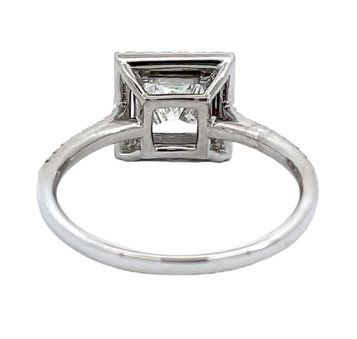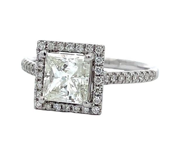 One electronically tested 14KT white gold lady's cast square basket halo wedding ring with a cathedral shank with a bright polish finish. The featured lady's ring has a shank measuring 1.60 millimeters wide. Identified with markings of "14K". Condition is new, good workmanship. Containing: One prong set princess cut diamond, measuring 6.35 x 6.06 x 4.19mm (depth est.) approximate weight of 1.31ct. Graded in the setting. Color I Clarity I-1 Cut Very Good Forty prong set round brilliant cut diamonds, measuring 1.15 - 1.10 x 0.68mm (depth est.) approximate total weight of 40 Stones = 0.20ct. Graded in the setting. Color G - H Clarity VS-2 to SI-1 Cut Very Good Total Weight of Diamonds 1.51ct. Total Weight of Wedding Ring 2.70gm