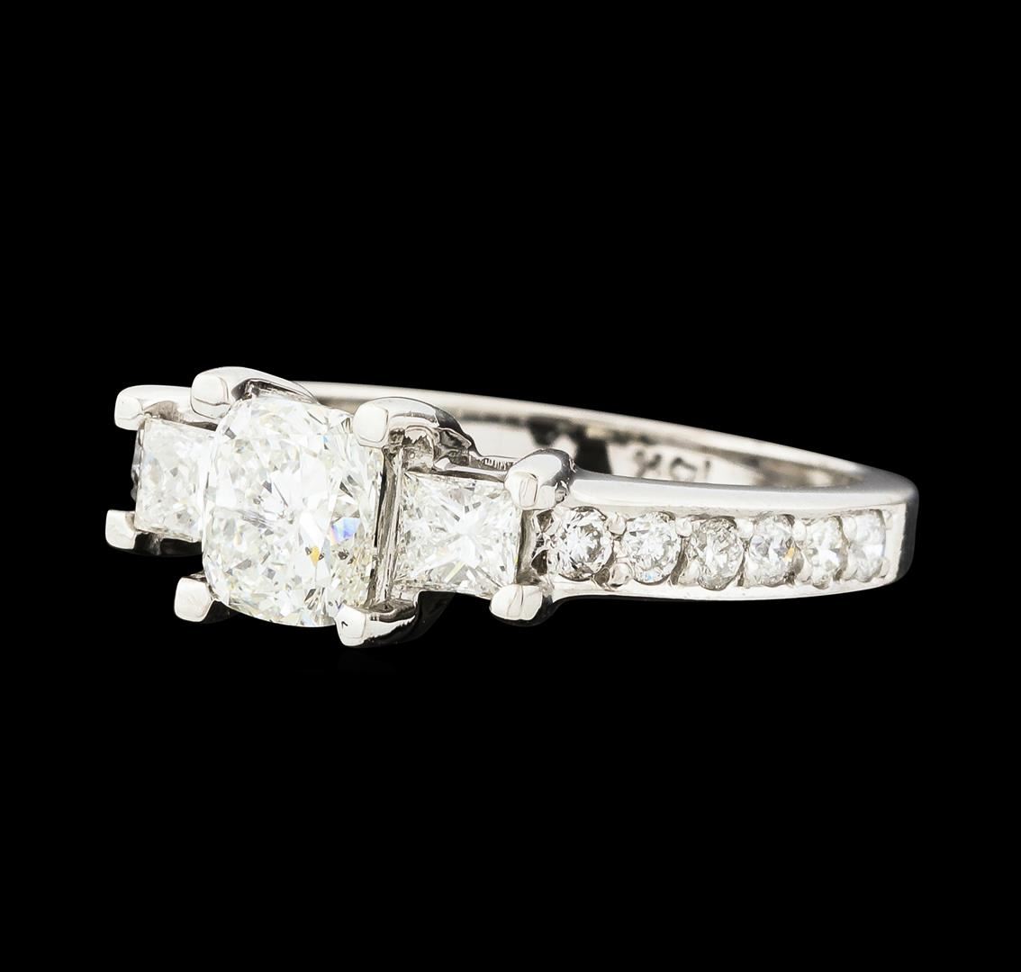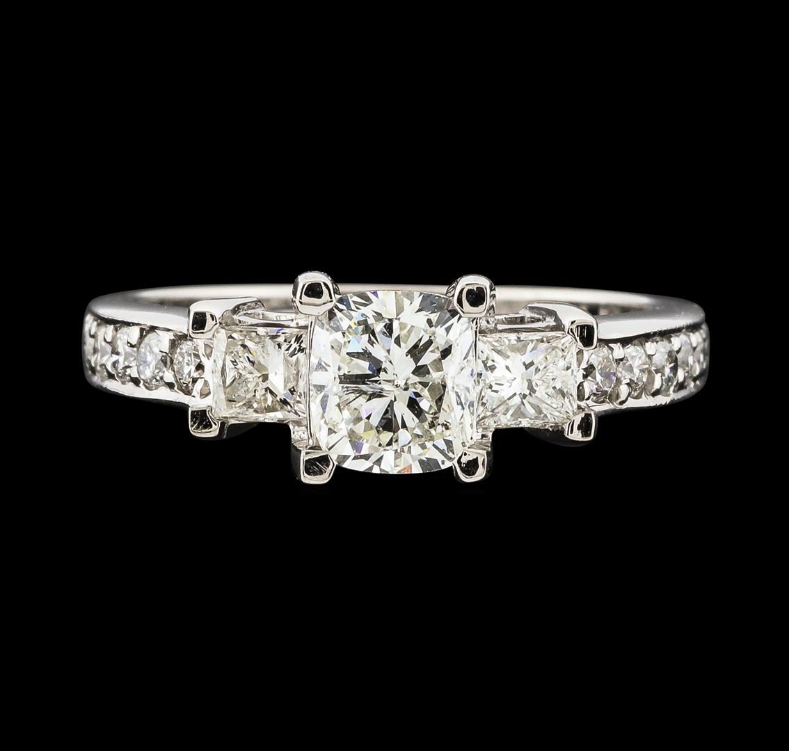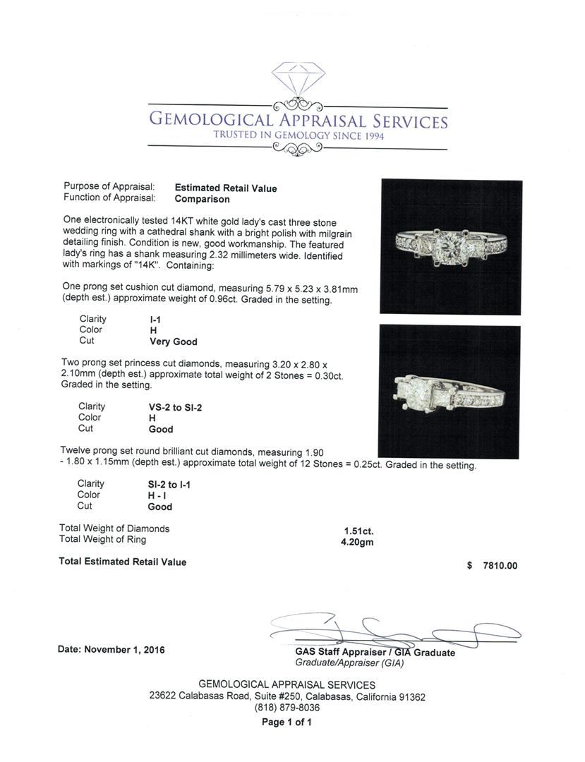 One electronically tested 14KT white gold lady's cast three stone wedding ring with a cathedral shank with a bright polish with milgrain detailing finish. The featured lady's ring has a shank measuring 2.32 millimeters wide. Identified with markings of '14K'. Condition is new, good workmanship. Containing: One prong set cushion cut diamond, measuring 5.79 x 5.23 x 3.81mm (depth est.) approximate weight of 0.96ct. Graded in the setting. Clarity I-1. Color: H Cut Very Good Two prong set princess cut diamonds, measuring 3.20 x 2.80 x 2.10mm (depth est.) approximate total weight of 2 Stones = 0.30ct. Graded in the setting. Clarity VS-2 to SI-2. Color: H Cut Good Twelve prong set round brilliant cut diamonds, measuring 1.90 - 1.80 x 1.15mm (depth est.) approximate total weight of 12 Stones = 0.25ct. Graded in the setting. Clarity SI-2 to I-1. Color: H - I Cut Good. Total Weight of Diamonds 1.51ct.. Total Weight of Ring 4.20gm. GAS Appraised at $7,810.00.