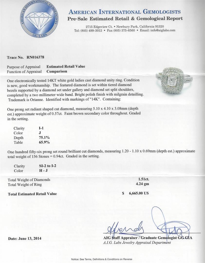 One electronically tested white gold ladies cast diamond unity ring. Condition is new, good workmanship. The featured diamond is set within tiered diamond bezels supported by a diamond set under gallery and diamond set split shoulders, completed by a two millimeter wide band. Bright polish finish with milgrain detaining. Trademark is Orianne. Containing: One prong set radiant shaped cut diamond, measuring 5.10x4.10x 3.08mm (depth est.) approximate weight of0.57ct. Faint brown secondary color throughout. Graded in the setting. Clarity: I-1.Color: J. Depth: 75.1%.Table: 65.9%.One hundred fifty-six prong set round brilliant cut diamonds, measuring 1.20 - 1.10 x 0.69mm (depth est.) approximate total weight of 156 Stones = 0.94ct. Graded in the setting. Clarity: SI-2 to I-2.Color: H - J. AIG Appraised at $6,665.00.