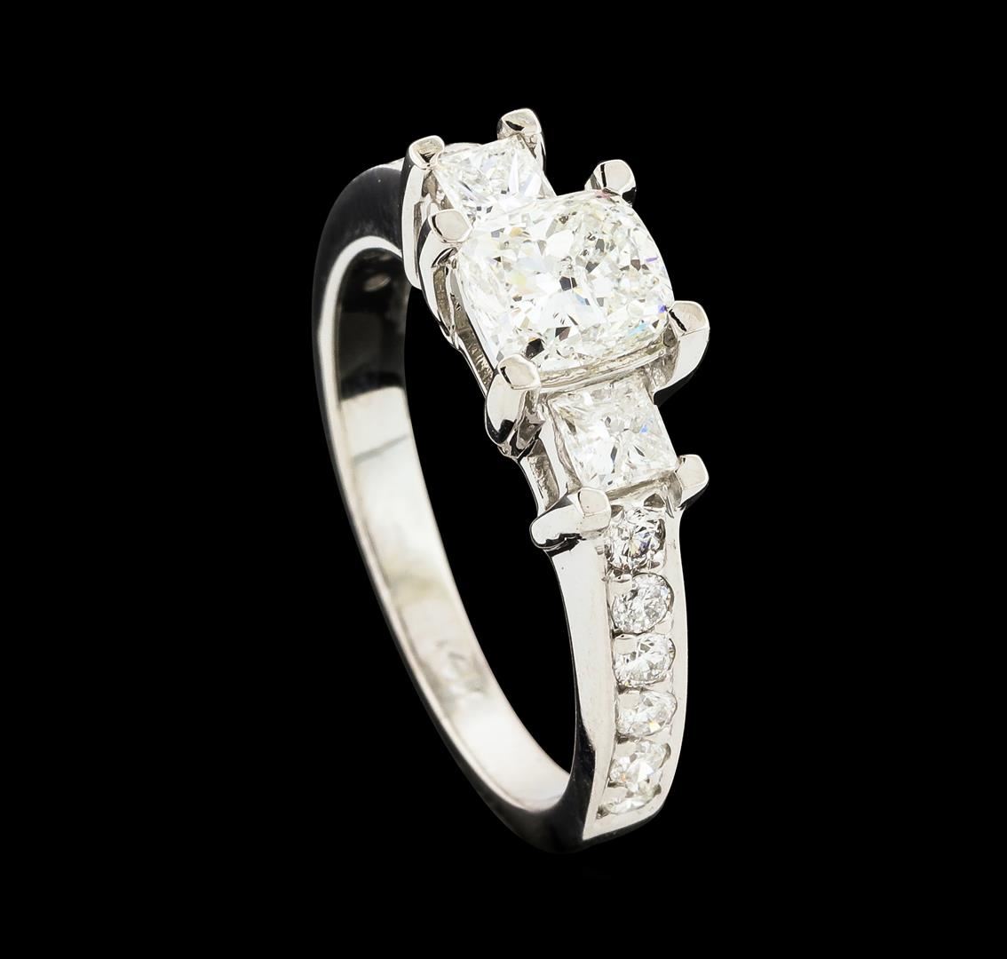 One electronically tested 14KT white gold lady's cast three stone wedding ring with a cathedral shank with a bright polish with milgrain detailing finish. The featured lady's ring has a shank measuring 2.32 millimeters wide. Identified with markings of '14K'. Condition is new, good workmanship. Containing: One prong set cushion cut diamond, measuring 5.79 x 5.23 x 3.81mm (depth est.) approximate weight of 0.96ct. Graded in the setting. Clarity I-1. Color: H Cut Very Good Two prong set princess cut diamonds, measuring 3.20 x 2.80 x 2.10mm (depth est.) approximate total weight of 2 Stones = 0.30ct. Graded in the setting. Clarity VS-2 to SI-2. Color: H Cut Good Twelve prong set round brilliant cut diamonds, measuring 1.90 - 1.80 x 1.15mm (depth est.) approximate total weight of 12 Stones = 0.25ct. Graded in the setting. Clarity SI-2 to I-1. Color: H - I Cut Good. Total Weight of Diamonds 1.51ct.. Total Weight of Ring 4.20gm. GAS Appraised at $7,810.00.