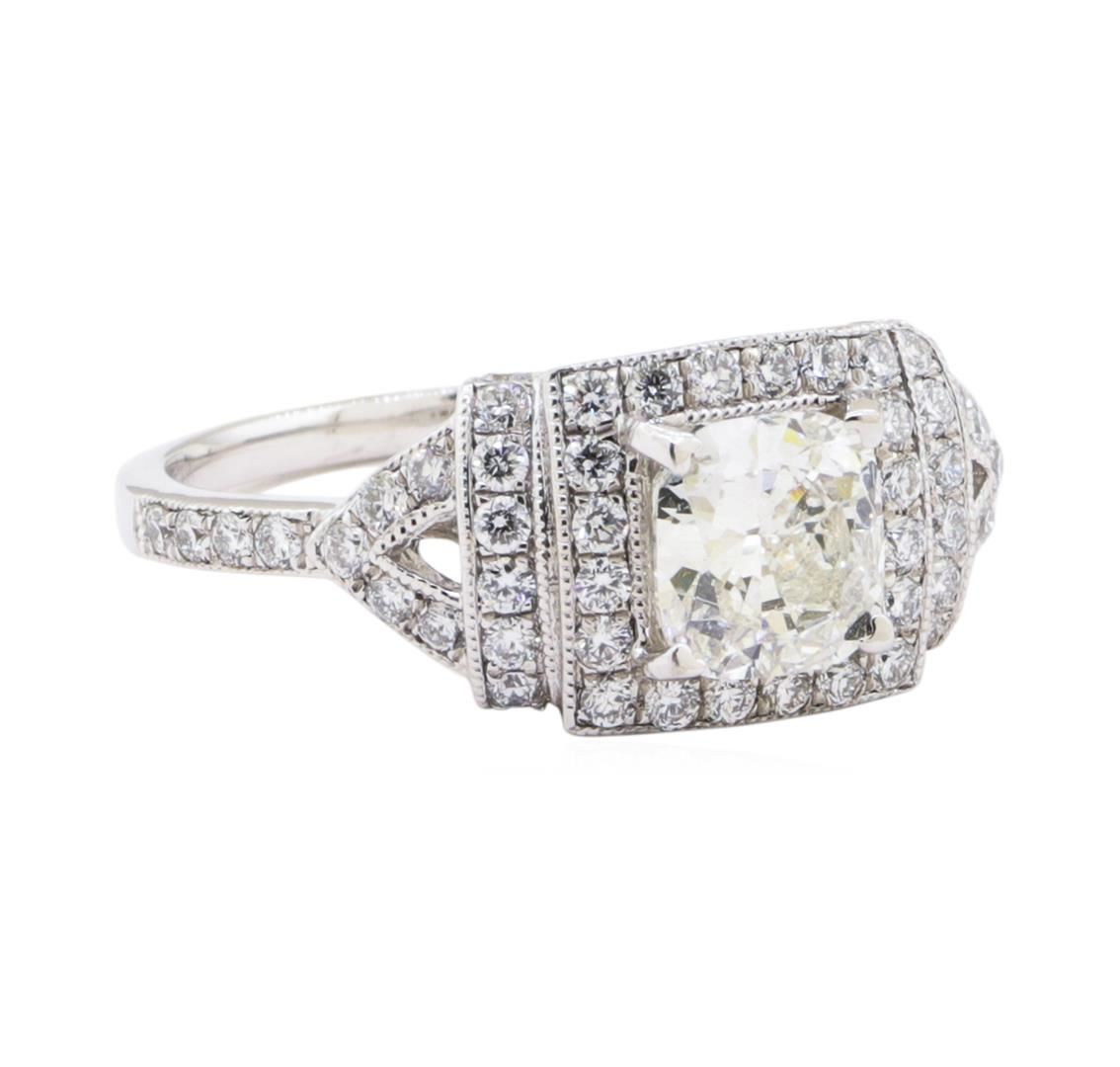 One electronically tested platinum ladies cast diamond unity ring. The featured diamond is set within a tiered diamond bezel, supported by a lattice under gallery and diamond set shoulders, completed by a one millimeter wide band. Trademark is Orianne. Identified with markings of "PT950". Condition is new, good workmanship. Containing: One prong set cushion cut diamond, measuring 6.28 x 5.75 x 3.45mm (depth est.) approximate weight of 0.98ct. Graded in the setting. Clarity SI-3 Color H Depth 60.0% Table 63.5% Fifty-Four prong set round brilliant cut diamonds, measuring 1.40 - 1.30 x 0.82mm (depth est.) approximate total weight of 54 Stones = 0.53ct. Graded in the setting. Clarity VS-2 to SI-1 Color G - I Total Weight of Diamonds 1.51 ct. Total Weight of Ring 5.60 gm Estimated Retail Value $ 9,155.00 US