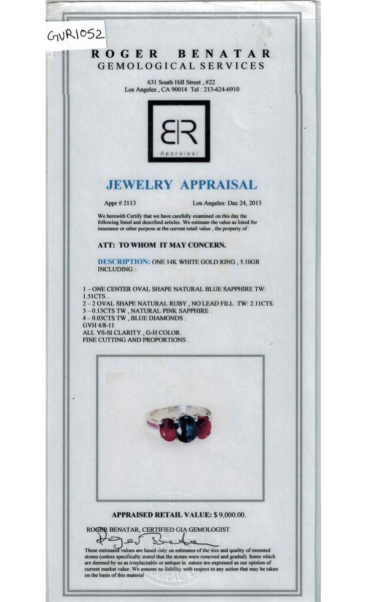 14K WHITE GOLD RING:5.10GRAMS/BLUE DIAMOND:0.03CT/PINK SAPPHIRE:0.13CT/BLUE SAPPHIRE:1.51CT/RUBY:2.11CT/#GVR1052/ No Lead or Glass filling