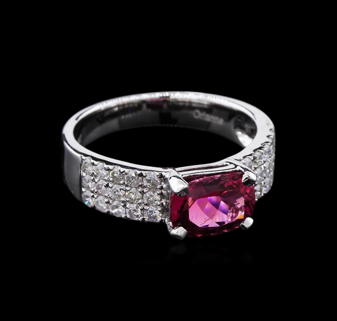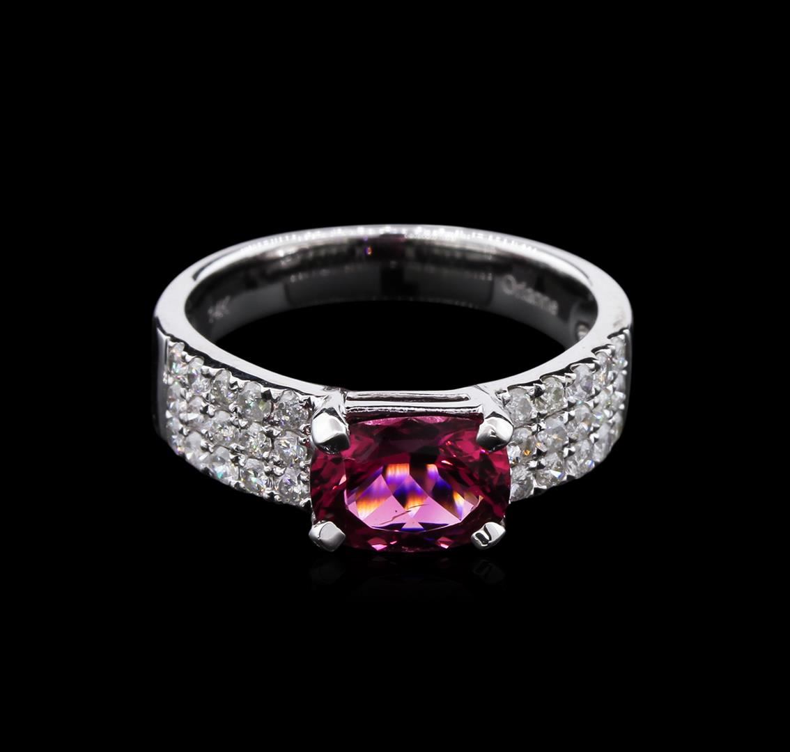 Fourteen karat (14K) white gold rubellite tourmaline and diamond ring. An oval cut rubellite tourmaline gemstone is prong mounted in the center of the ring. Round brilliant cut diamonds accent the ring on both sides of the center gemstone. The ring is cast stamped "14K" and has a gross weight of 4.3 Grams. Diamond(s): Shape: Round Brilliant cut. Weight: 0.59 carat. Average Clarity: I1. Average Color: H-J. Symmetry: Very Good. Polish: Very Good. GemStone(s): GemStone: Rubellite Tourmaline. Nature: Natural. Shape: Oval, Faceted. Quantity: 1, Mounted. Weight: 1.51 carat. Dimensions: Length- 8.29 mm ; Width- 6.25 mm. Bulge: Visible: Clarity: VS, Type 2. Color: Pink (4/5). Symmetry: Very Good. Color Intensity: Medium. Transparency: Transparent. Tone: Medium. Metal(s): Metal: Gold, Stamped. Purity: 14K. Color: White. Condition: Excellent. Finish: High polish. GGA Appraised at $6,940.00.