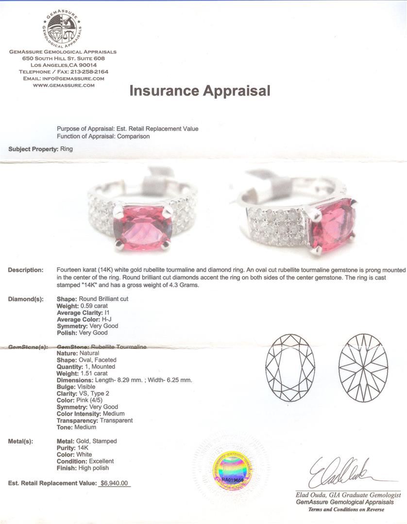 Fourteen karat (14K) white gold rubellite tourmaline and diamond ring. An oval cut rubellite tourmaline gemstone is prong mounted in the center of the ring. Round brilliant cut diamonds accent the ring on both sides of the center gemstone. The ring is cast stamped "14K" and has a gross weight of 4.3 Grams. Diamond(s): Shape: Round Brilliant cut. Weight: 0.59 carat. Average Clarity: I1. Average Color: H-J. Symmetry: Very Good. Polish: Very Good. GemStone(s): GemStone: Rubellite Tourmaline. Nature: Natural. Shape: Oval, Faceted. Quantity: 1, Mounted. Weight: 1.51 carat. Dimensions: Length- 8.29 mm ; Width- 6.25 mm. Bulge: Visible: Clarity: VS, Type 2. Color: Pink (4/5). Symmetry: Very Good. Color Intensity: Medium. Transparency: Transparent. Tone: Medium. Metal(s): Metal: Gold, Stamped. Purity: 14K. Color: White. Condition: Excellent. Finish: High polish. GGA Appraised at $6,940.00.