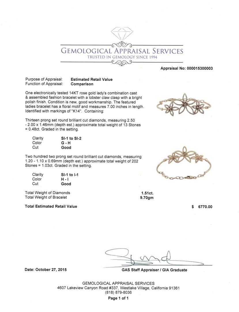 One electronically tested 14KT rose gold lady's combination cast & assembled fashion bracelet with a lobster claw clasp with a bright polish finish. The featured ladies bracelet has a floral motif and measures 7.00 inches in length. Identified with markings of "K14". Condition is new, good workmanship. Containing: Thirteen prong set round brilliant cut diamonds, measuring 2.50 - 2.00 x 1.46mm (depth est.) approximate total weight of 13 Stones = 0.48ct. Graded in the setting. Clarity: SI-1 to SI-2. Color: G - Good Two Hundred Two prong set round brilliant cut diamonds, measuring 1.20 - 1.10 x 0.69mm (depth est.) approximate total weight of 202 Stones = 1.03ct. Graded in the setting. Clarity: SI-1 to I-1. Color: H - I. Cut Good. Total Weight of Diamonds 1.51ct. Total Weight of Bracelet 9.70gm. GAS Appraised at $6,770.00.