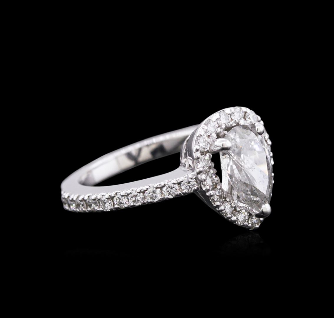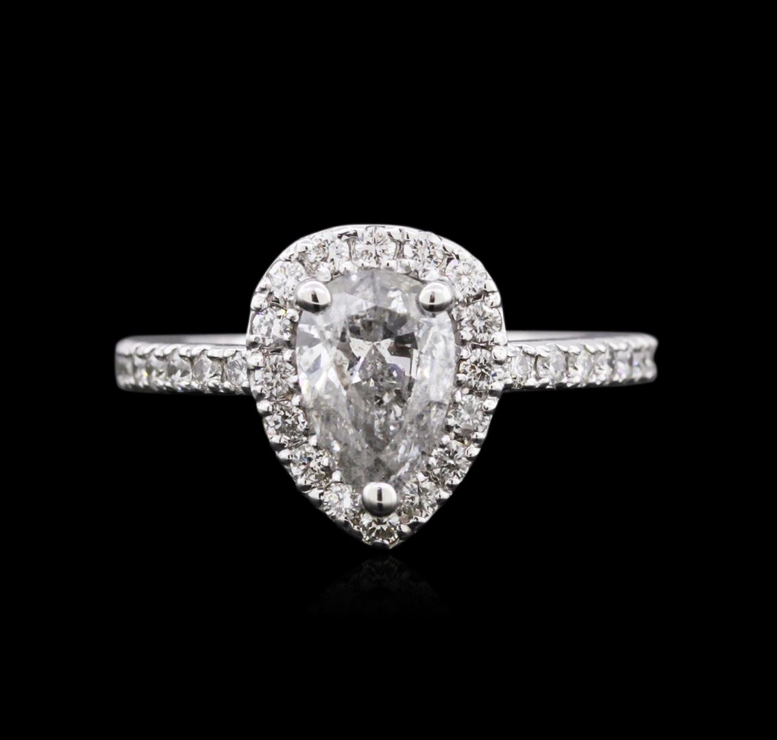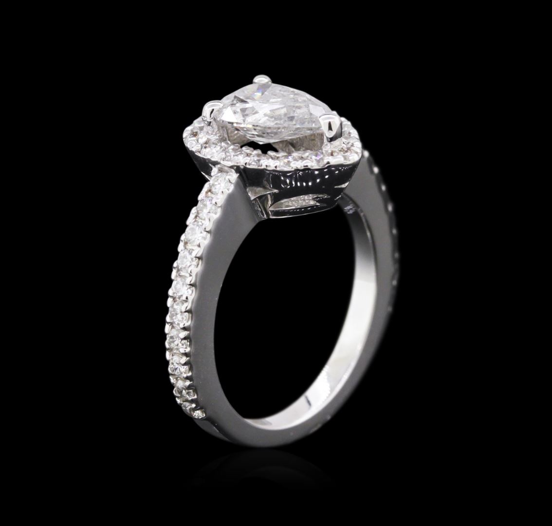 One electronically tested 14KT white gold ladies cast diamond engagement ring with a bright polish finish. Identified with markings of "14K". Condition is new. Containing: One prong set pear shaped cut diamond, measuring 8.50 x 5.50 x 4.20mm (depth est.) approximate weight of 1.03ct. Clarity: I-3. Color: J, Cut is Good. Thirty-Six prong set round brilliant cut diamonds, measuring 1.50 - 1.50 x 0.90mm (depth est.) approximate total weight of 36 Stones = 0.48ct. Clarity: SI-2. Color: I, Cut is Good. Diamonds are graded in the mounting, unless otherwise stated. Total Weight of Diamonds 1.51ct. Total Weight of Engagement Ring 4.50 grams. GGL Appraised at $3,940.00.
