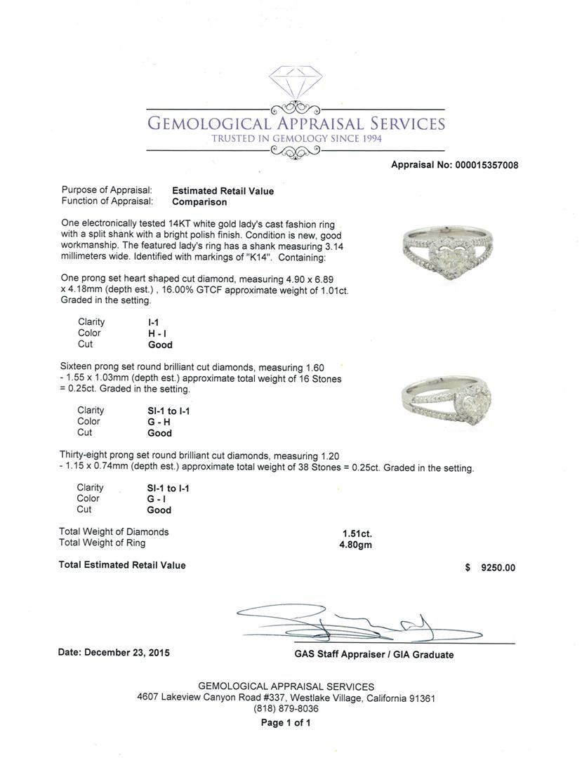 One electronically tested 14KT white gold lady's cast fashion ring with a split shank with a bright polish finish. The featured lady's ring has a shank measuring 3.14 millimeters wide. Identified with markings of "K14". Condition is new, good workmanship. Containing: One prong set heart shaped cut diamond, measuring 4.90 x 6.89 x 4.18mm (depth est.) , 16.00% GTCF approximate weight of 1.01ct. Graded in the setting. Clarity: I-1. Color: H - I. Cut Good Sixteen prong set round brilliant cut diamonds, measuring 1.60 - 1.55 x 1.03mm (depth est.) approximate total weight of 16 Stones = 0.25ct. Graded in the setting. Clarity: SI-1 to I-1. Color: G - Good Thirty-Eight prong set round brilliant cut diamonds, measuring 1.20 - 1.15 x 0.74mm (depth est.) approximate total weight of 38 Stones = 0.25ct. Graded in the setting. Clarity: SI-1 to I-1. Color: G - I. Cut Good. Total Weight of Diamonds 1.51ct. Total Weight of Ring 4.80gm. GAS Appraised at $9,250.00.