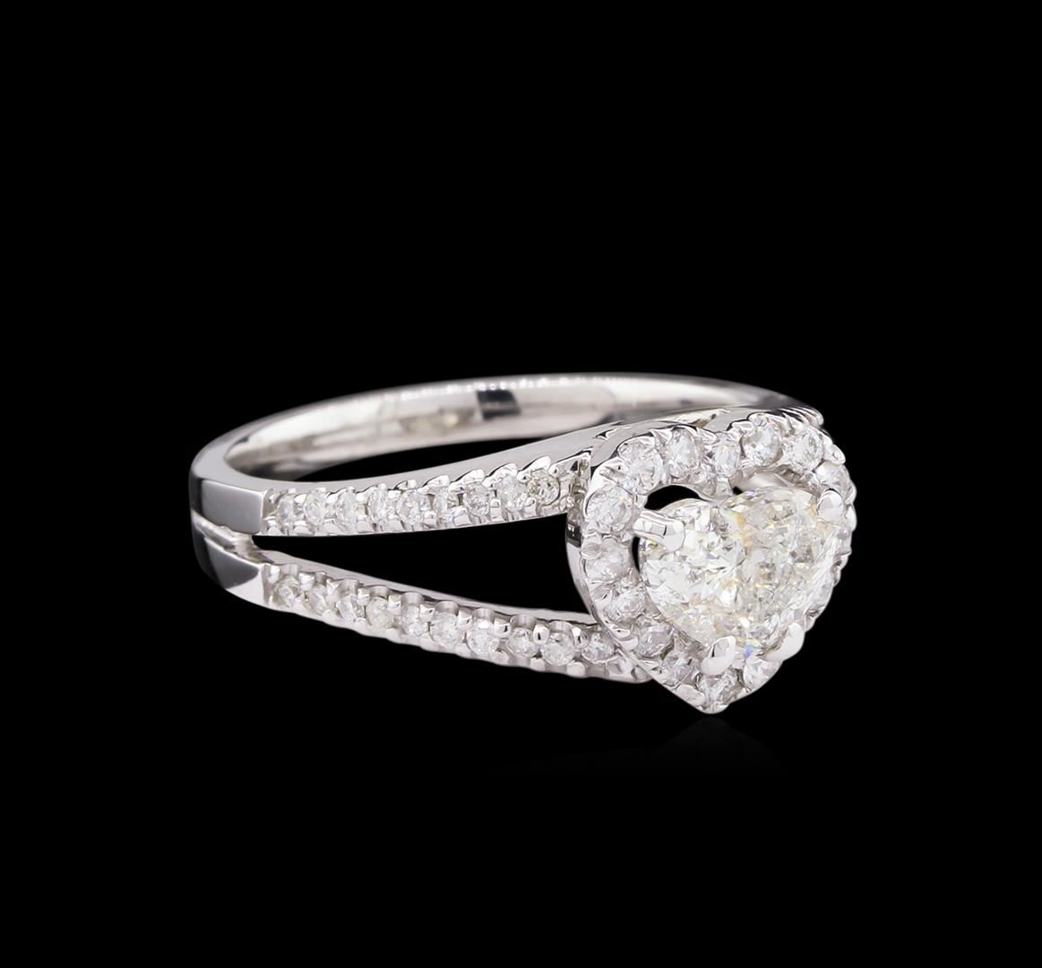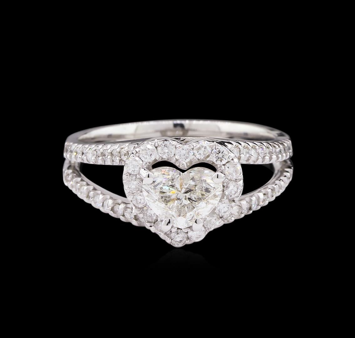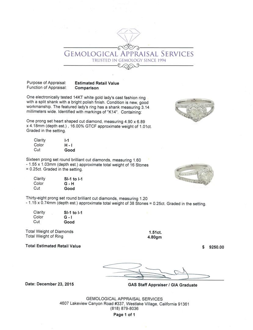 One electronically tested 14KT white gold lady's cast fashion ring with a split shank with a bright polish finish. The featured lady's ring has a shank measuring 3.14 millimeters wide. Identified with markings of "K14". Condition is new, good workmanship. Containing: One prong set heart shaped cut diamond, measuring 4.90 x 6.89 x 4.18mm (depth est.) , 16.00% GTCF approximate weight of 1.01ct. Graded in the setting. Clarity: I-1. Color: H - I. Cut Good Sixteen prong set round brilliant cut diamonds, measuring 1.60 - 1.55 x 1.03mm (depth est.) approximate total weight of 16 Stones = 0.25ct. Graded in the setting. Clarity: SI-1 to I-1. Color: G - Good Thirty-Eight prong set round brilliant cut diamonds, measuring 1.20 - 1.15 x 0.74mm (depth est.) approximate total weight of 38 Stones = 0.25ct. Graded in the setting. Clarity: SI-1 to I-1. Color: G - I. Cut Good. Total Weight of Diamonds 1.51ct. Total Weight of Ring 4.80gm. GAS Appraised at $9,250.00.