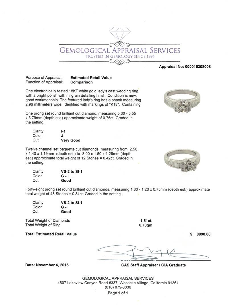 One electronically tested 18KT white gold lady's cast wedding ring with a bright polish with milgrain detailing finish. The featured lady's ring has a shank measuring 2.96 millimeters wide. Identified with markings of "K18". Condition is new, good workmanship. Containing: One prong set round brilliant cut diamond, measuring 5.60 - 5.55 x 3.79mm (depth est.) approximate weight of 0.75ct. Graded in the setting. Clarity: I-1. Color: Very Good Twelve channel set baguette cut diamonds, measuring from 2.50 x 1.40 x 1.19mm (depth est.) to 3.00 x 1.50 x 1.28mm (depth est.) approximate total weight of 12 Stones = 0.42ct. Graded in the setting. Clarity: VS-2 to SI-1. Color: G - I. Cut Good Forty-Eight prong set round brilliant cut diamonds, measuring 1.30 - 1.20 x 0.75mm (depth est.) approximate total weight of 48 Stones = 0.34ct. Graded in the setting. Clarity: VS-2 to SI-1. Color: G - I. Cut Good. Total Weight of Diamonds 1.51ct. Total Weight of Ring 6.70gm GAS Appraised at $8,890.00.