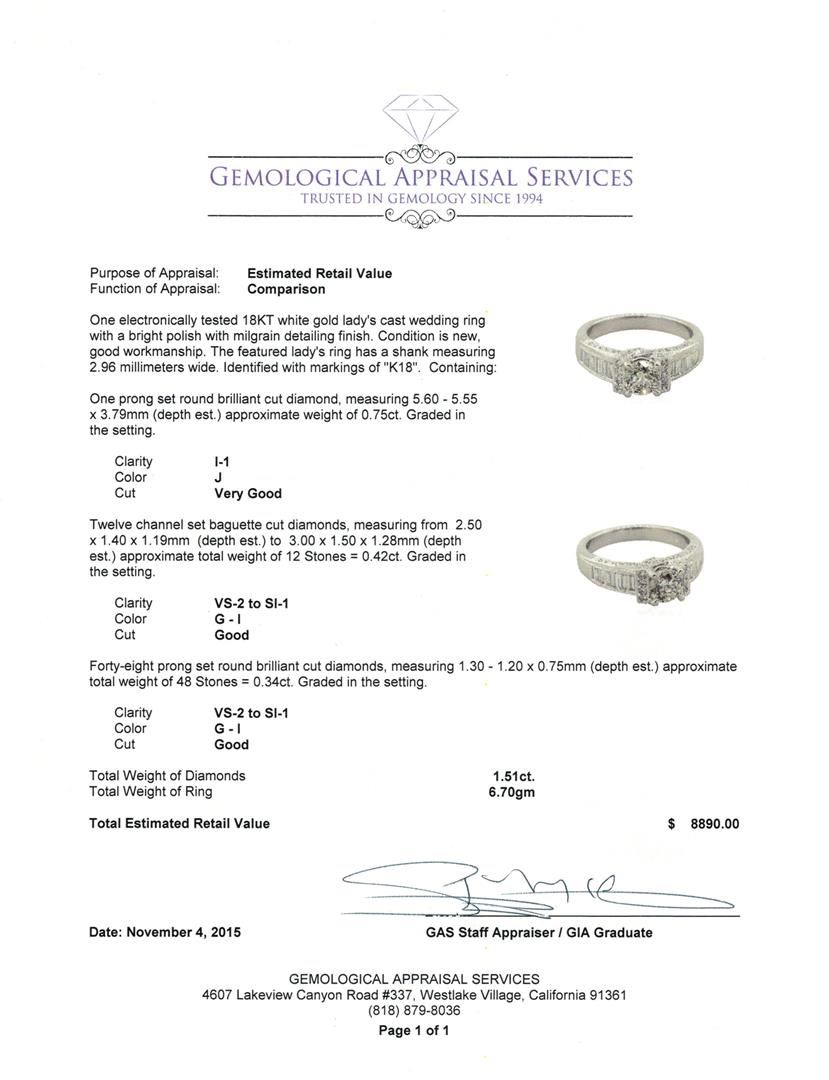 One electronically tested 18KT white gold lady's cast wedding ring with a bright polish with milgrain detailing finish. The featured lady's ring has a shank measuring 2.96 millimeters wide. Identified with markings of "K18". Condition is new, good workmanship. Containing: One prong set round brilliant cut diamond, measuring 5.60 - 5.55 x 3.79mm (depth est.) approximate weight of 0.75ct. Graded in the setting. Clarity: I-1. Color: Very Good Twelve channel set baguette cut diamonds, measuring from 2.50 x 1.40 x 1.19mm (depth est.) to 3.00 x 1.50 x 1.28mm (depth est.) approximate total weight of 12 Stones = 0.42ct. Graded in the setting. Clarity: VS-2 to SI-1. Color: G - I. Cut Good Forty-Eight prong set round brilliant cut diamonds, measuring 1.30 - 1.20 x 0.75mm (depth est.) approximate total weight of 48 Stones = 0.34ct. Graded in the setting. Clarity: VS-2 to SI-1. Color: G - I. Cut Good. Total Weight of Diamonds 1.51ct. Total Weight of Ring 6.70gm GAS Appraised at $8,890.00.