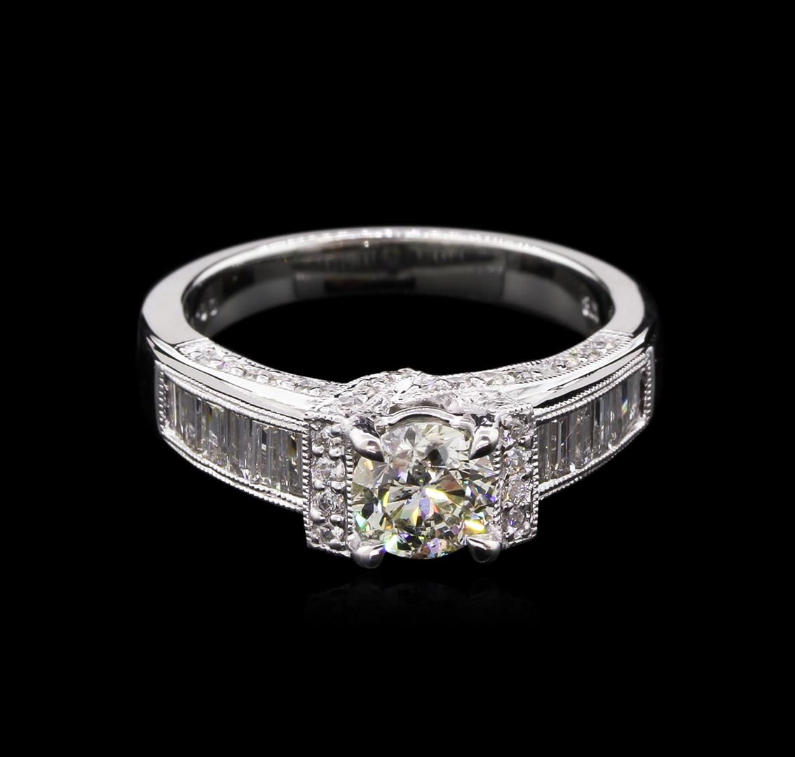 One electronically tested 18KT white gold lady's cast wedding ring with a bright polish with milgrain detailing finish. The featured lady's ring has a shank measuring 2.96 millimeters wide. Identified with markings of "K18". Condition is new, good workmanship. Containing: One prong set round brilliant cut diamond, measuring 5.60 - 5.55 x 3.79mm (depth est.) approximate weight of 0.75ct. Graded in the setting. Clarity: I-1. Color: Very Good Twelve channel set baguette cut diamonds, measuring from 2.50 x 1.40 x 1.19mm (depth est.) to 3.00 x 1.50 x 1.28mm (depth est.) approximate total weight of 12 Stones = 0.42ct. Graded in the setting. Clarity: VS-2 to SI-1. Color: G - I. Cut Good Forty-Eight prong set round brilliant cut diamonds, measuring 1.30 - 1.20 x 0.75mm (depth est.) approximate total weight of 48 Stones = 0.34ct. Graded in the setting. Clarity: VS-2 to SI-1. Color: G - I. Cut Good. Total Weight of Diamonds 1.51ct. Total Weight of Ring 6.70gm GAS Appraised at $8,890.00.