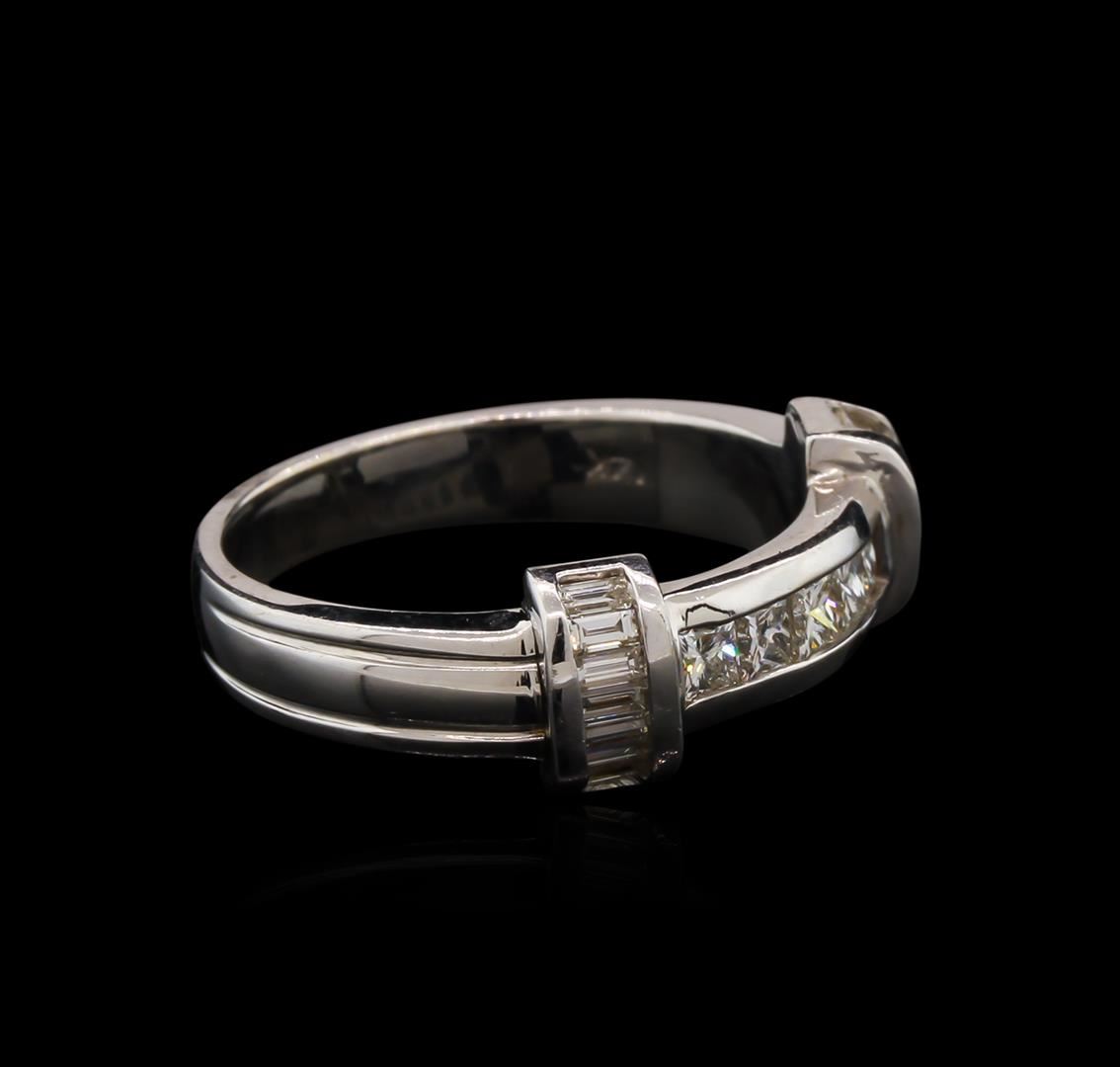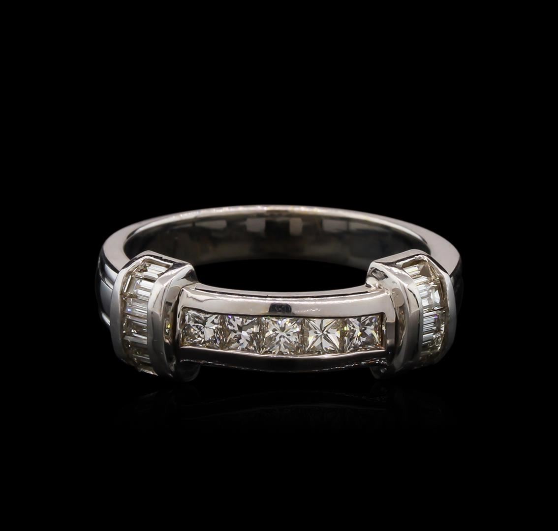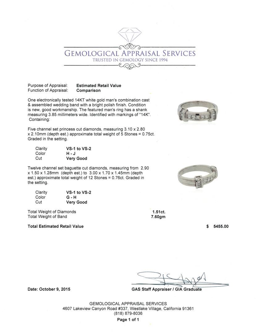 One electronically tested 14KT white gold man's combination cast & assembled wedding band with a bright polish finish. The featured man's ring has a shank measuring 3.85 millimeters wide. Identified with markings of "14K". Condition is new, good workmanship. Containing: Five channel set princess cut diamonds, measuring 3.10 x 2.80 x 2.10mm (depth est.) approximate total weight of 5 Stones = 0.75ct. Graded in the setting. Clarity: VS-1 to VS-2. Color: H - Very Good Twelve channel set baguette cut diamonds, measuring from 2.90 x 1.50 x 1.28mm (depth est.) to 3.00 x 1.70 x 1.45mm (depth est.) approximate total weight of 12 Stones = 0.76ct. Graded in the setting. Clarity: VS-1 to VS-2. Color: G - Very Good. Total Weight of Diamonds 1.51ct. Total Weight of Band 7.60gm. GAS Appraised at $5,455.00.