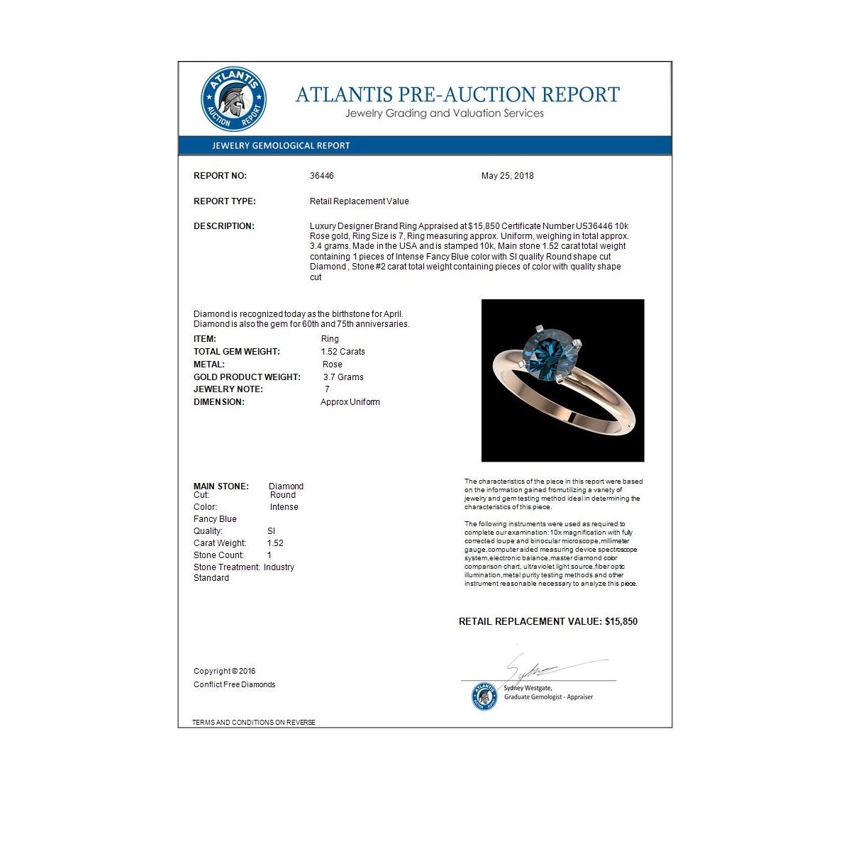 REF-240X2T -36446 ---- 1.52 CTW Certified Intense Blue SI Diamond Solitaire Engagement Ring 10K Rose Gold ---- Luxury Designer Brand Ring Appraised at $15,850 Certificate Number US36446 10k Rose gold, Ring Size is 7, Ring measuring approx. Uniform, weighing in total approx. 3.4 grams. Made in the USA and is stamped 10k, Main stone 1.52 carat total weight containing 1 pieces of Intense Fancy Blue color with SI quality Round shape cut Diamond , Stone #2 carat total weight containing pieces of color with quality shape cut