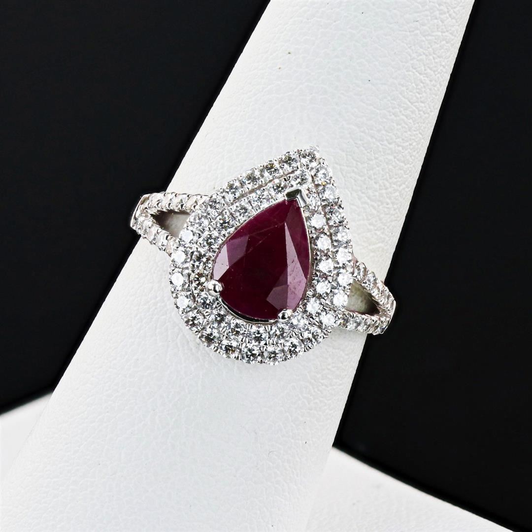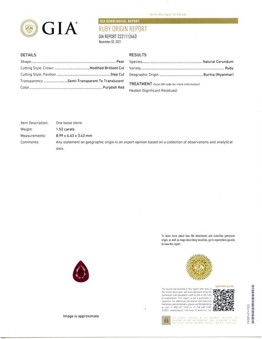 1.52ct BURMESE Ruby and 0.82ctw Diamond Platinum Ring (GIA CERTIFIED). Platinum (PLAT) natural burmese ruby corundum and diamond ring. A pear brilliant cut natural burmese ruby corundum gemstone is mounted in the center of the ring. Round brilliant cut diamonds accent the ring around and on both sides of the center gemstone. The ring has a gross weight of 5.6 Grams. Reference: GIA Ruby Report 2221112463 NATURAL GEMSTONE GEMSTONE: Burma Ruby Corundum NATURE: Natural SHAPE: Pear Brilliant, Faceted Cut WEIGHT: 1.52 carat total DIMENSIONS: 8.99 x 6.63 x 3.43mm CLARITY: Type 3 COLOR: Purplish Red (5/5) SYMMETRY: Excellent COLOR INTENSITY: Intense TRANSPARENCY: Semi-Transparent-Translucent TONE: Dark NATURAL DIAMOND SHAPE: Round Brilliant Cut WEIGHT: 0.82 carat total (66pcs.) DIMENSIONS: 1.5 x 1.4mm AVERAGE CLARITY: VS1-VS2 AVERAGE COLOR: F-G SYMMETRY: Excellent POLISH: Excellent METAL METAL: Platinum PURITY: 950 COLOR: White CONDITION: Excellent FINISH: High Polish