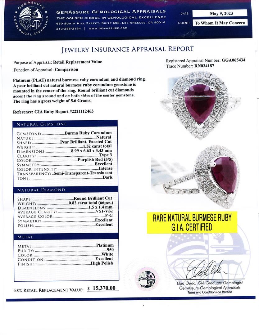 1.52ct BURMESE Ruby and 0.82ctw Diamond Platinum Ring (GIA CERTIFIED). Platinum (PLAT) natural burmese ruby corundum and diamond ring. A pear brilliant cut natural burmese ruby corundum gemstone is mounted in the center of the ring. Round brilliant cut diamonds accent the ring around and on both sides of the center gemstone. The ring has a gross weight of 5.6 Grams. Reference: GIA Ruby Report 2221112463 NATURAL GEMSTONE GEMSTONE: Burma Ruby Corundum NATURE: Natural SHAPE: Pear Brilliant, Faceted Cut WEIGHT: 1.52 carat total DIMENSIONS: 8.99 x 6.63 x 3.43mm CLARITY: Type 3 COLOR: Purplish Red (5/5) SYMMETRY: Excellent COLOR INTENSITY: Intense TRANSPARENCY: Semi-Transparent-Translucent TONE: Dark NATURAL DIAMOND SHAPE: Round Brilliant Cut WEIGHT: 0.82 carat total (66pcs.) DIMENSIONS: 1.5 x 1.4mm AVERAGE CLARITY: VS1-VS2 AVERAGE COLOR: F-G SYMMETRY: Excellent POLISH: Excellent METAL METAL: Platinum PURITY: 950 COLOR: White CONDITION: Excellent FINISH: High Polish