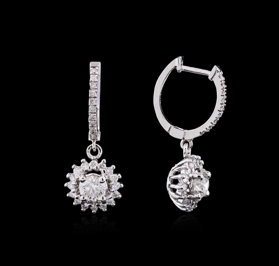 One pair electronically tested 14KT white gold ladies cast diamond earrings with hinged clip backs with a bright polish finish. Identified with markings of "14K". Condition is new. Containing: Two prong set round brilliant cut diamonds, measuring 5.10 - 5.10 x 3.06mm (depth est.) approximate. Total Weight of 2 Stones = 1.02ct. Clarity: I-1 to I-2. Color: J, Cut is Good. Fifty prong set round brilliant cut diamonds, measuring 1.30 - 1.30 x 0.78mm (depth est.) approximate. Total Weight of 50 Stones = 0.50ct. Clarity: I-1 to I-2. Color: I - J, Cut is Good. Diamonds are graded in the mounting, unless otherwise stated. Total Weight of Diamonds 1.52ct. Total Weight of Earrings 4.40 grams. GGL Appraised at $4,260.00.