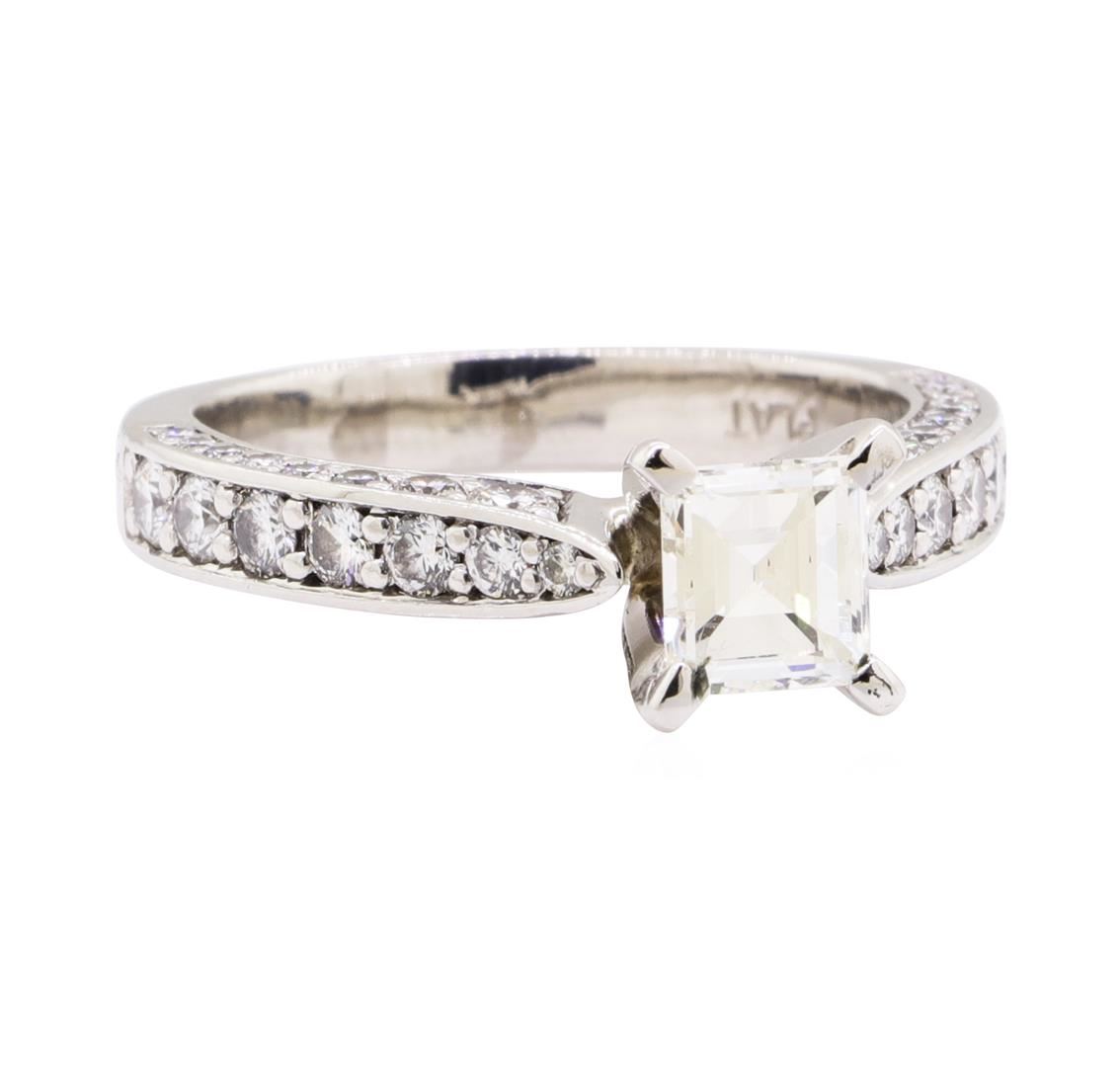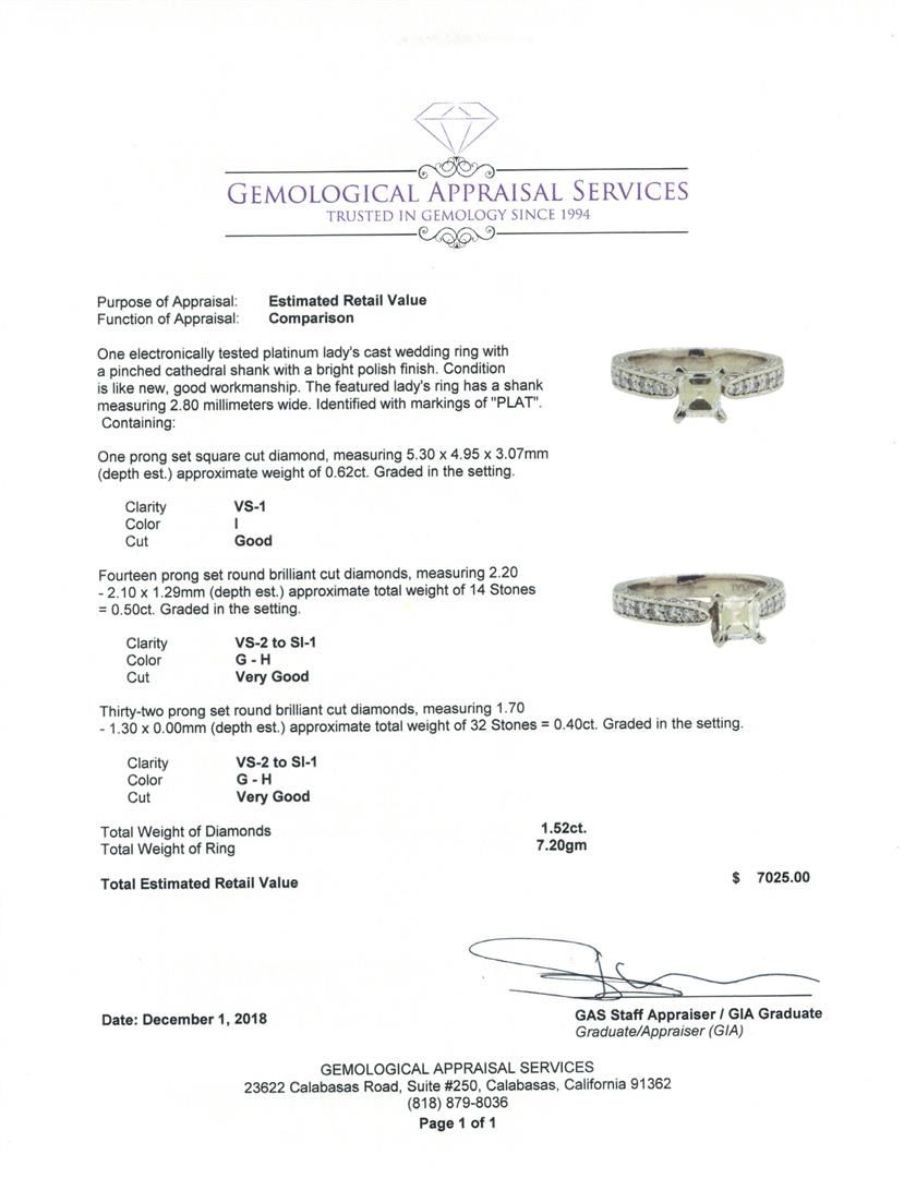 One electronically tested platinum lady's cast wedding ring with a pinched cathedral shank with a bright polish finish. The featured lady's ring has a shank measuring 2.80 millimeters wide. Identified with markings of 'PLAT'. Condition is like new, good workmanship. Containing: One prong set square cut diamond, measuring 5.30 x 4.95 x 3.07mm (depth est.) approximate weight of 0.62ct. Graded in the setting. Color I Clarity VS-1 Cut Good Fourteen prong set round brilliant cut diamonds, measuring 2.20 - 2.10 x 1.29mm (depth est.) approximate total weight of 14 Stones = 0.50ct. Graded in the setting. Color G - H Clarity VS-2 to SI-1 Cut Very Good Thirty-Two prong set round brilliant cut diamonds, measuring 1.70 - 1.30 x 0.00mm (depth est.) approximate total weight of 32 Stones = 0.40ct. Graded in the setting. Color G - H Clarity VS-2 to SI-1 Cut Very Good. Total Weight of Diamonds 1.52ct.. Total Weight of Ring 7.20gm GAS Appraised at $7025.00. GAS Appraised at $7,025.00.