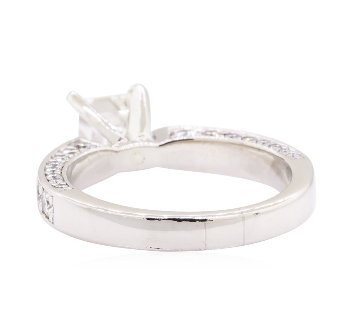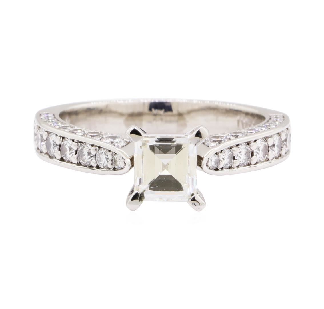 One electronically tested platinum lady's cast wedding ring with a pinched cathedral shank with a bright polish finish. The featured lady's ring has a shank measuring 2.80 millimeters wide. Identified with markings of 'PLAT'. Condition is like new, good workmanship. Containing: One prong set square cut diamond, measuring 5.30 x 4.95 x 3.07mm (depth est.) approximate weight of 0.62ct. Graded in the setting. Color I Clarity VS-1 Cut Good Fourteen prong set round brilliant cut diamonds, measuring 2.20 - 2.10 x 1.29mm (depth est.) approximate total weight of 14 Stones = 0.50ct. Graded in the setting. Color G - H Clarity VS-2 to SI-1 Cut Very Good Thirty-Two prong set round brilliant cut diamonds, measuring 1.70 - 1.30 x 0.00mm (depth est.) approximate total weight of 32 Stones = 0.40ct. Graded in the setting. Color G - H Clarity VS-2 to SI-1 Cut Very Good. Total Weight of Diamonds 1.52ct.. Total Weight of Ring 7.20gm GAS Appraised at $7025.00. GAS Appraised at $7,025.00.