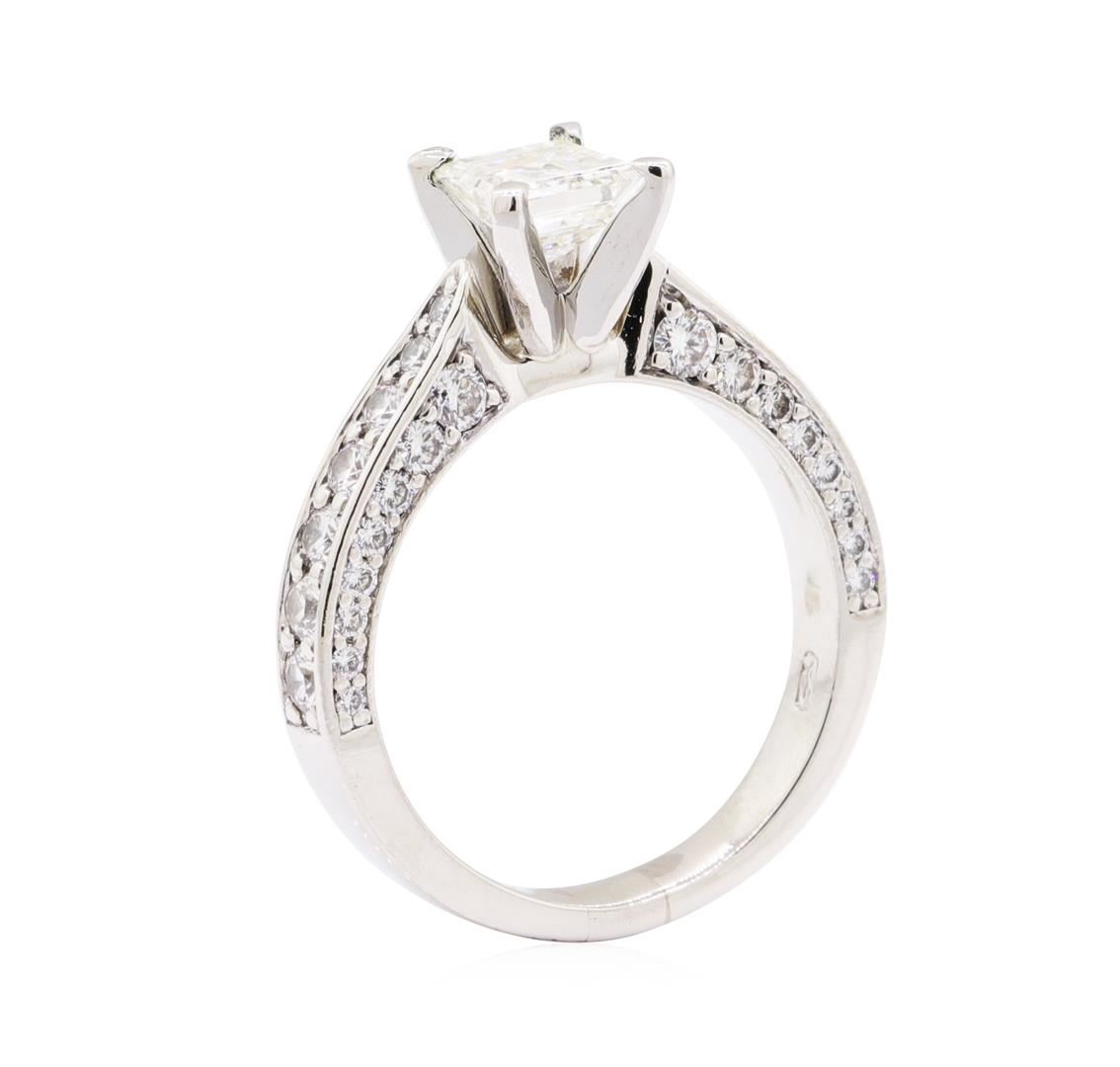 One electronically tested platinum lady's cast wedding ring with a pinched cathedral shank with a bright polish finish. The featured lady's ring has a shank measuring 2.80 millimeters wide. Identified with markings of 'PLAT'. Condition is like new, good workmanship. Containing: One prong set square cut diamond, measuring 5.30 x 4.95 x 3.07mm (depth est.) approximate weight of 0.62ct. Graded in the setting. Color I Clarity VS-1 Cut Good Fourteen prong set round brilliant cut diamonds, measuring 2.20 - 2.10 x 1.29mm (depth est.) approximate total weight of 14 Stones = 0.50ct. Graded in the setting. Color G - H Clarity VS-2 to SI-1 Cut Very Good Thirty-Two prong set round brilliant cut diamonds, measuring 1.70 - 1.30 x 0.00mm (depth est.) approximate total weight of 32 Stones = 0.40ct. Graded in the setting. Color G - H Clarity VS-2 to SI-1 Cut Very Good. Total Weight of Diamonds 1.52ct.. Total Weight of Ring 7.20gm GAS Appraised at $7025.00. GAS Appraised at $7,025.00.