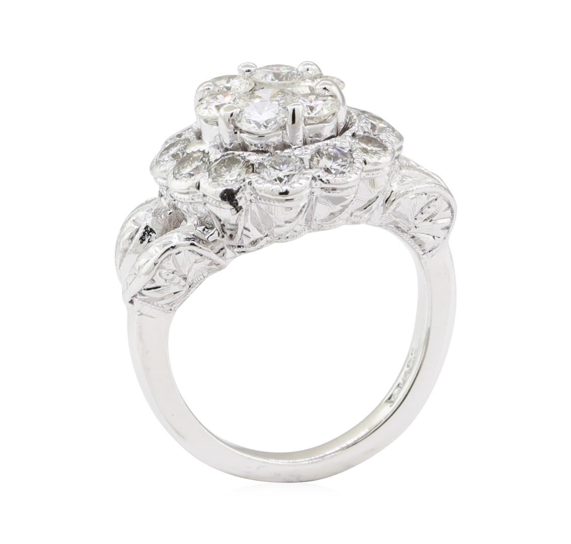 One electronically tested platinum lady's combination cast & assembled fashion ring with a scalloped halo with a bright polish with milgrain detailing finish. The featured lady's ring has hand engraved detail and a shank measuring 2.00 millimeters wide. Identified with markings of 'PT 950'. Condition is like new, good workmanship. Containing: One prong set round brilliant cut diamond, measuring 3.80 - 3.75 x 2.34mm (depth est.) approximate weight of 0.20ct. Graded in the setting. Color H Clarity VS-2 Cut Very Good Six prong set round brilliant cut diamonds, measuring 3.10 - 3.00 x 1.89mm (depth est.) approximate total weight of 6 Stones = 0.65ct. Graded in the setting. Color H - I Clarity VS-2 to SI-1 Cut Very Good Twelve bead set round brilliant cut diamonds, measuring 2.50 - 2.40 x 1.52mm (depth est.) approximate total weight of 12 Stones = 0.67ct. Graded in the setting. Color G - H Clarity VS-1 to VS-2 Cut Good. Total Weight of Diamonds 1.52ct.. Total Weight of Ring 11.10gm GAS Appraised at $6375.00. GAS Appraised at $6,375.00.