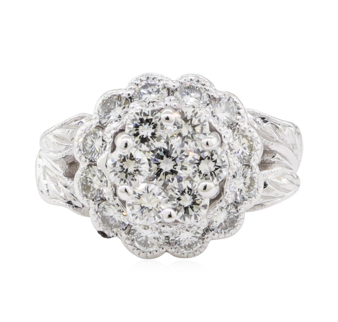 One electronically tested platinum lady's combination cast & assembled fashion ring with a scalloped halo with a bright polish with milgrain detailing finish. The featured lady's ring has hand engraved detail and a shank measuring 2.00 millimeters wide. Identified with markings of 'PT 950'. Condition is like new, good workmanship. Containing: One prong set round brilliant cut diamond, measuring 3.80 - 3.75 x 2.34mm (depth est.) approximate weight of 0.20ct. Graded in the setting. Color H Clarity VS-2 Cut Very Good Six prong set round brilliant cut diamonds, measuring 3.10 - 3.00 x 1.89mm (depth est.) approximate total weight of 6 Stones = 0.65ct. Graded in the setting. Color H - I Clarity VS-2 to SI-1 Cut Very Good Twelve bead set round brilliant cut diamonds, measuring 2.50 - 2.40 x 1.52mm (depth est.) approximate total weight of 12 Stones = 0.67ct. Graded in the setting. Color G - H Clarity VS-1 to VS-2 Cut Good. Total Weight of Diamonds 1.52ct.. Total Weight of Ring 11.10gm GAS Appraised at $6375.00. GAS Appraised at $6,375.00.