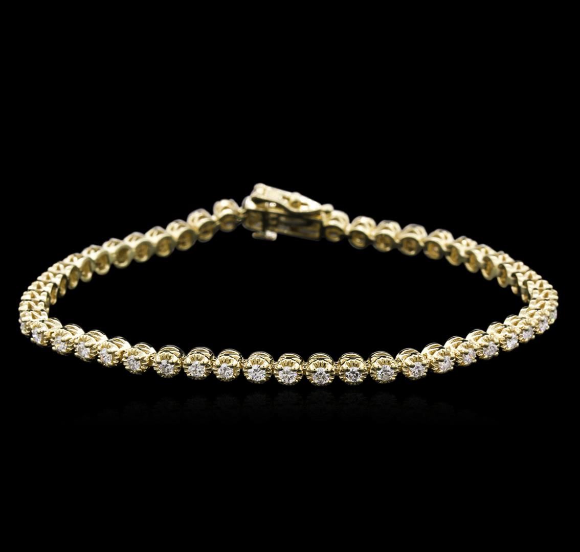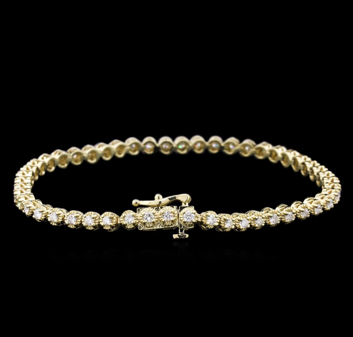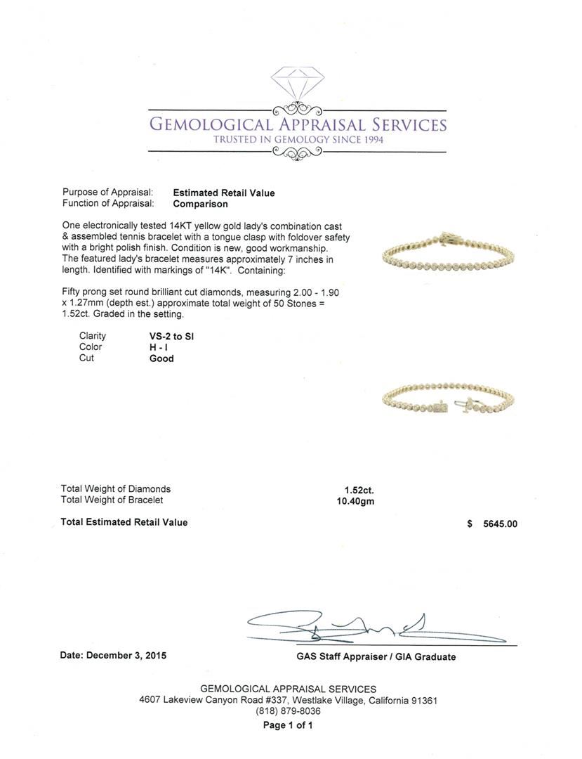 One electronically tested 14KT yellow gold lady's combination cast & assembled tennis bracelet with a tongue clasp with foldover safety with a bright polish finish. The featured lady's bracelet measures approximately 7 inches in length. Identified with markings of "14K". Condition is new, good workmanship. Containing: Fifty prong set round brilliant cut diamonds, measuring 2.00 - 1.90 x 1.27mm (depth est.) approximate total weight of 50 Stones = 1.52ct. Graded in the setting. Clarity: VS-2 to SI. Color: H - I. Cut Good. Total Weight of Diamonds 1.52ct. Total Weight of Bracelet 10.40gm. GAS Appraised.