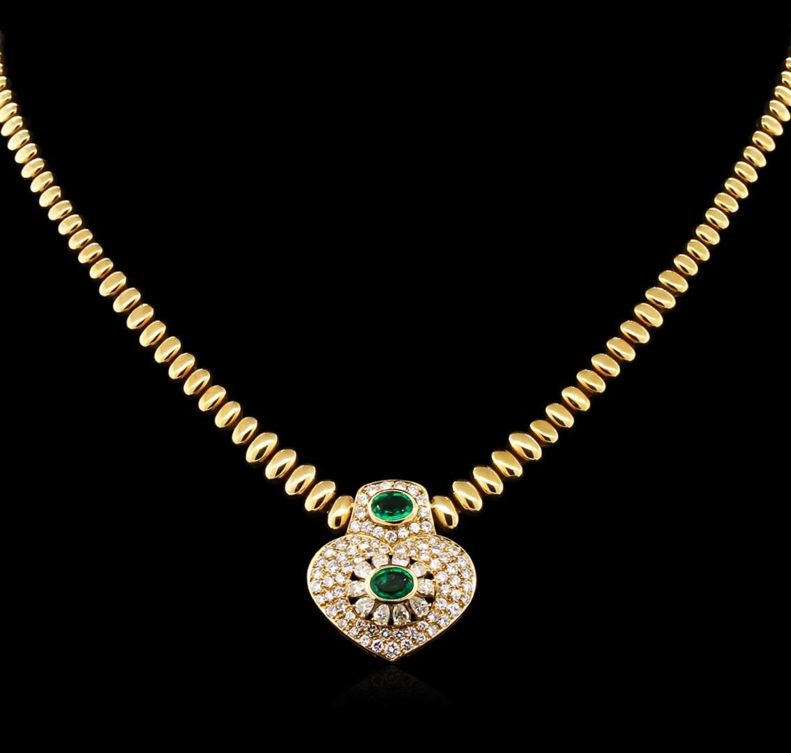 One electronically tested 14KT yellow gold lady's combination cast & assembled fashion necklace with a tongue clasp with fold over safety with a bright polish finish. The featured lady's necklace has a heart shaped pendant motif and measures 18 inches in length. Identified with markings of "585". Condition is used, good workmanship. Containing: Two bezel set oval modified brilliant cut natural emeralds, measuring 7.50 x 5.50 x 2.70mm, 20% bulge factor, approximate total weight of 1.52ct., clarity is slightly included, type III, medium light, moderately strong, green color, (GIA G 4/4), cut is good. Naturally occurring internal & external characteristics are present. Colored gemstones are presumed to have been subjected to commonly used enhancement processes. Graded in the setting. Ten prong set pear shaped cut diamonds, measuring 4.00 x 2.70 x 1.76mm (depth est.) approximate total weight of 10 Stones = 1.14ct. Graded in the setting. Clarity: SI-1 to SI-2. Color: H - Good Seventy-Six bead set round brilliant cut diamonds, measuring 2.40 - 1.80 x 1.37mm (depth est.) approximate total weight of 76 Stones = 2.80ct. Graded in the setting. Clarity: VS-2 to SI-2. Color: G - I. Cut Good. Total Weight of Colored Stones 1.52ct. Total Weight of Diamonds 3.94ct. Total Weight of Necklace 38.60gm. GAS Appraised at $14,735.00.