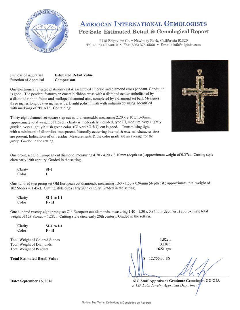 One electronically tested platinum cast & assembled emerald and diamond cross pendant. The pendant features an emerald ribbon cross with a diamond center embellished by a diamond ribbon frame and scalloped diamond trim, completed by a diamond set bail. Measures three inches long by two inches wide. Bright polish finish with milgrain detailing. Identified with markings of 'PLAT'. Condition is good. Containing: Thirty-eight channel set square step cut natural emeralds, measuring 2.20 x 2.10 x 1.40mm, approximate total weight of 1.52ct., clarity is moderately included, type III, medium, very slightly grayish, very slightly bluish green color, (GIA vslbG 5/3), cut is good. Transmitting light with a minimum of distortion, transparent. Naturally occurring internal & external characteristics are present. Indications of oil residue. Measurements & the color grade are an average for the group. Graded in the setting. One prong set Old European cut diamond, measuring 4.70 - 4.20 x 3.10mm (depth est.) approximate weight of 0.37ct. Cutting style circa early 19th century. Graded in the setting. Clarity SI-2. Color: I One Hundred Two prong set Old European cut diamonds, measuring 1.60 - 1.50 x 0.96mm (depth est.) approximate total weight of 102 Stones = 1.45ct. Cutting style circa early 20th century. Graded in the setting. Clarity SI-1 to I-1. Color: F - H One Hundred Twenty-Eight prong set Old European cut diamonds, measuring 1.40 - 1.30 x 0.84mm (depth est.) approximate total weight of 128 Stones = 1.28ct. Cutting style circa early 20th century. Graded in the setting. Clarity SI-1 to I-1. Color: F - H. Total Weight of Colored Stones 1.52ct.. Total Weight of Diamonds 3.10ct.. Total Weight of Pendant 16.51gm. AIG Appraised at $12,755.00.