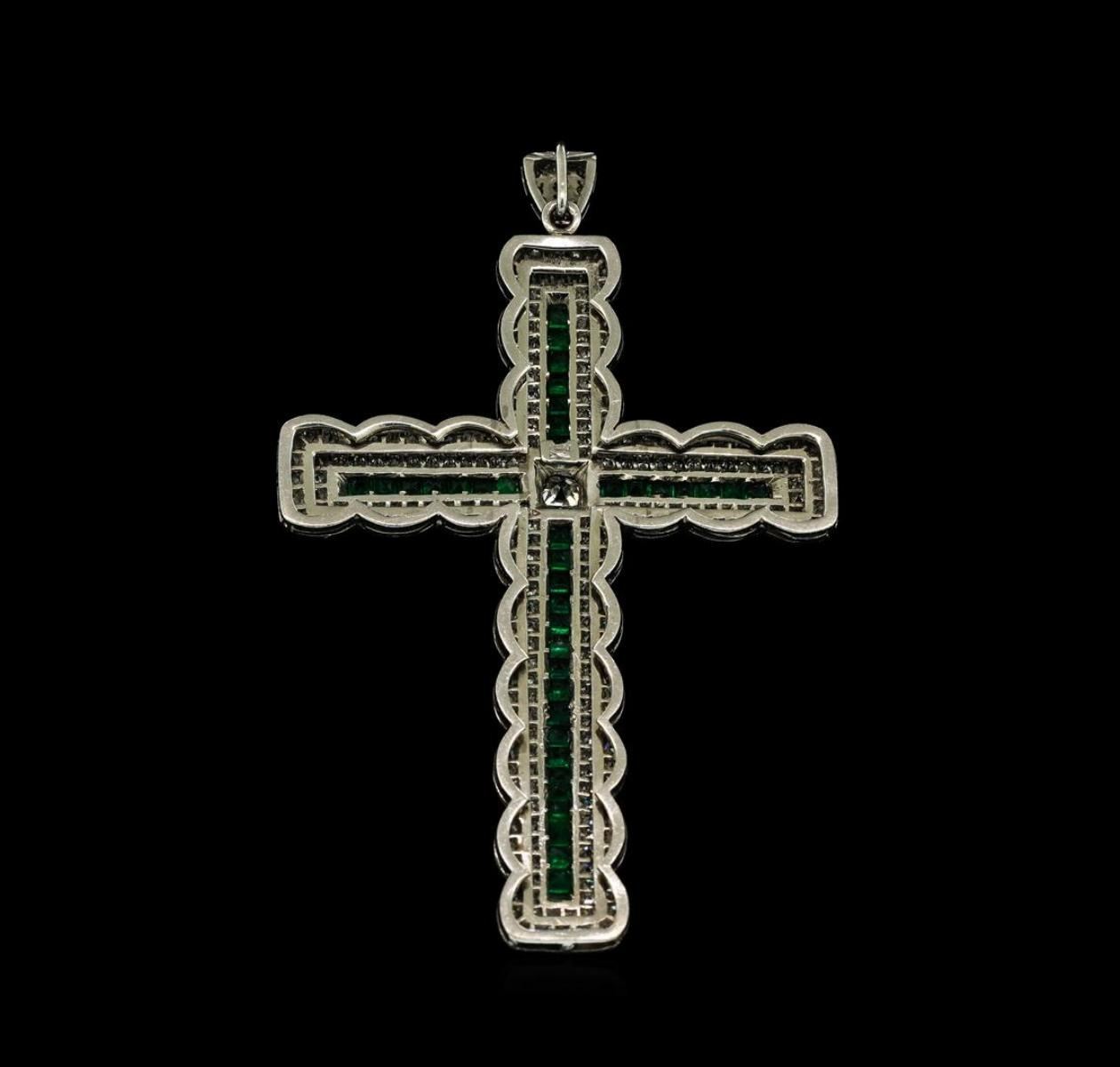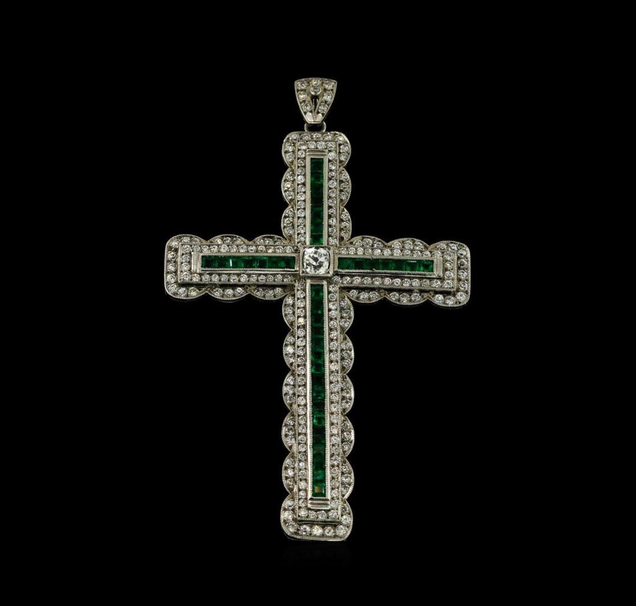 One electronically tested platinum cast & assembled emerald and diamond cross pendant. The pendant features an emerald ribbon cross with a diamond center embellished by a diamond ribbon frame and scalloped diamond trim, completed by a diamond set bail. Measures three inches long by two inches wide. Bright polish finish with milgrain detailing. Identified with markings of 'PLAT'. Condition is good. Containing: Thirty-eight channel set square step cut natural emeralds, measuring 2.20 x 2.10 x 1.40mm, approximate total weight of 1.52ct., clarity is moderately included, type III, medium, very slightly grayish, very slightly bluish green color, (GIA vslbG 5/3), cut is good. Transmitting light with a minimum of distortion, transparent. Naturally occurring internal & external characteristics are present. Indications of oil residue. Measurements & the color grade are an average for the group. Graded in the setting. One prong set Old European cut diamond, measuring 4.70 - 4.20 x 3.10mm (depth est.) approximate weight of 0.37ct. Cutting style circa early 19th century. Graded in the setting. Clarity SI-2. Color: I One Hundred Two prong set Old European cut diamonds, measuring 1.60 - 1.50 x 0.96mm (depth est.) approximate total weight of 102 Stones = 1.45ct. Cutting style circa early 20th century. Graded in the setting. Clarity SI-1 to I-1. Color: F - H One Hundred Twenty-Eight prong set Old European cut diamonds, measuring 1.40 - 1.30 x 0.84mm (depth est.) approximate total weight of 128 Stones = 1.28ct. Cutting style circa early 20th century. Graded in the setting. Clarity SI-1 to I-1. Color: F - H. Total Weight of Colored Stones 1.52ct.. Total Weight of Diamonds 3.10ct.. Total Weight of Pendant 16.51gm. AIG Appraised.