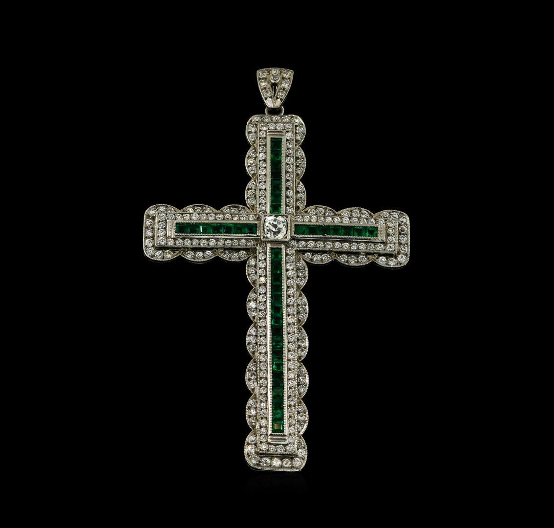 One electronically tested platinum cast & assembled emerald and diamond cross pendant. The pendant features an emerald ribbon cross with a diamond center embellished by a diamond ribbon frame and scalloped diamond trim, completed by a diamond set bail. Measures three inches long by two inches wide. Bright polish finish with milgrain detailing. Identified with markings of 'PLAT'. Condition is good. Containing: Thirty-eight channel set square step cut natural emeralds, measuring 2.20 x 2.10 x 1.40mm, approximate total weight of 1.52ct., clarity is moderately included, type III, medium, very slightly grayish, very slightly bluish green color, (GIA vslbG 5/3), cut is good. Transmitting light with a minimum of distortion, transparent. Naturally occurring internal & external characteristics are present. Indications of oil residue. Measurements & the color grade are an average for the group. Graded in the setting. One prong set Old European cut diamond, measuring 4.70 - 4.20 x 3.10mm (depth est.) approximate weight of 0.37ct. Cutting style circa early 19th century. Graded in the setting. Clarity SI-2. Color: I One Hundred Two prong set Old European cut diamonds, measuring 1.60 - 1.50 x 0.96mm (depth est.) approximate total weight of 102 Stones = 1.45ct. Cutting style circa early 20th century. Graded in the setting. Clarity SI-1 to I-1. Color: F - H One Hundred Twenty-Eight prong set Old European cut diamonds, measuring 1.40 - 1.30 x 0.84mm (depth est.) approximate total weight of 128 Stones = 1.28ct. Cutting style circa early 20th century. Graded in the setting. Clarity SI-1 to I-1. Color: F - H. Total Weight of Colored Stones 1.52ct.. Total Weight of Diamonds 3.10ct.. Total Weight of Pendant 16.51gm. AIG Appraised.
