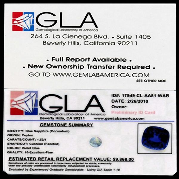Excellent very clear violet blue Ceylon specimen cushion cut; lab quality evaluation 10; typical treatment likely; Gem Guide wholesale $2508-$4256; full retail appraisal $9868; full lab evaluation available
