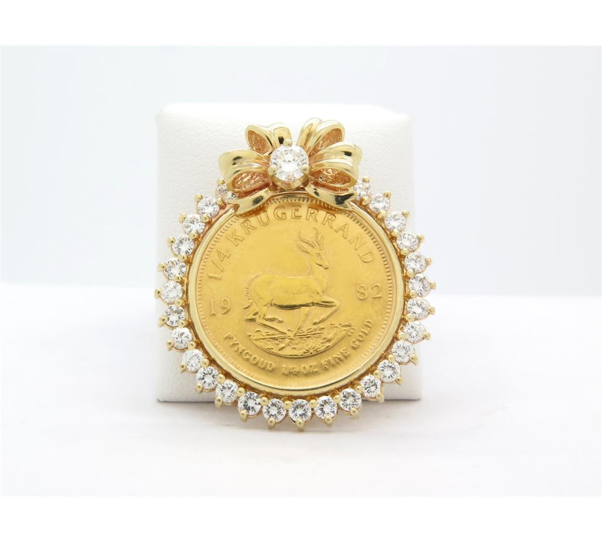 One tested 14K yellow gold pendant. Containing: 1 1982 1/4 Krugerrand, 28 Round Brilliant Cut Diamonds. Clarity: VS-SI, Color: G-H. Approximate total diamond weight: 1.52CTW. All diamonds are graded in the mounting unless otherwise stated. Weight of Necklace: 43.9 grams, Size of choker: 17 inches.