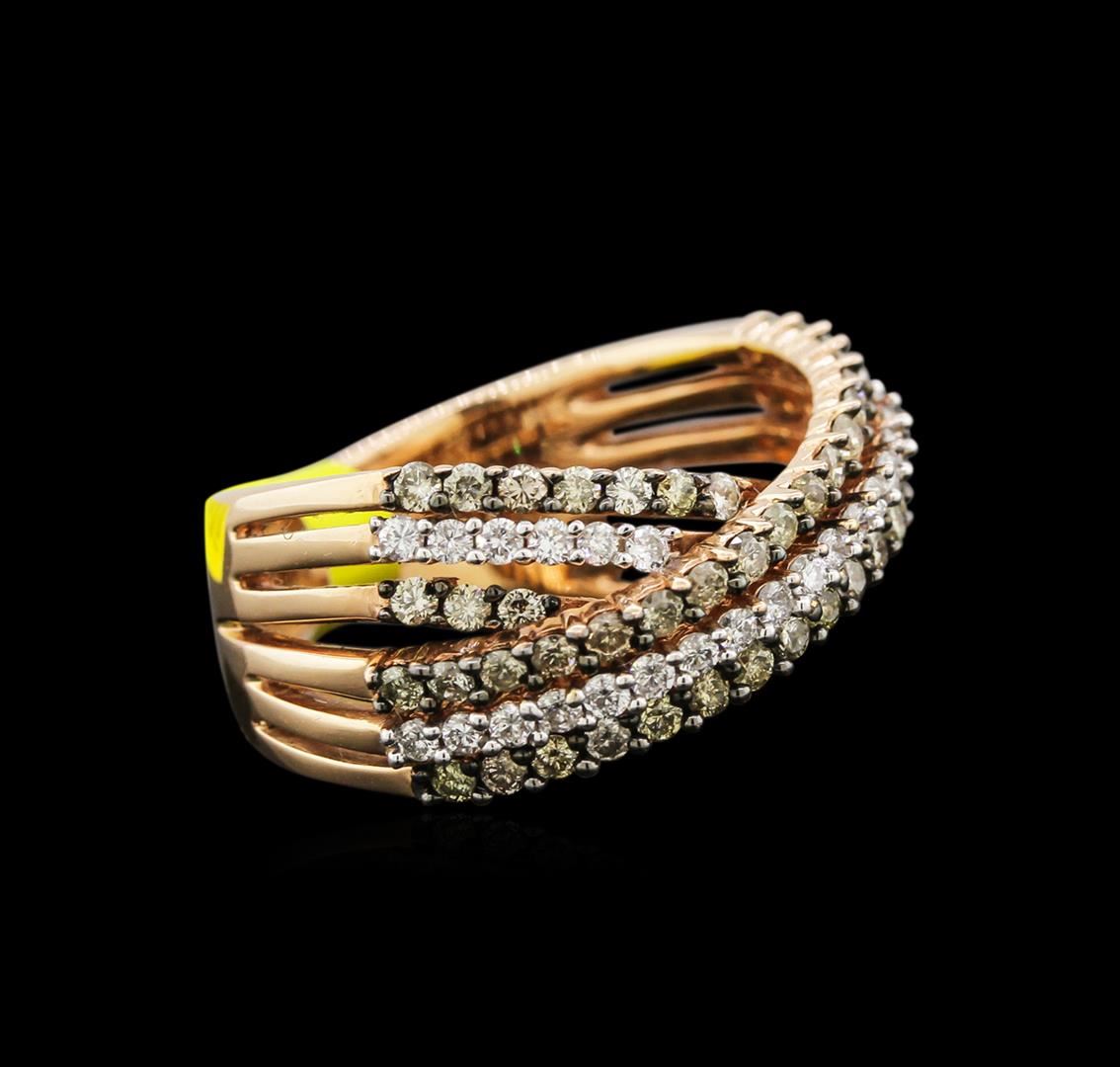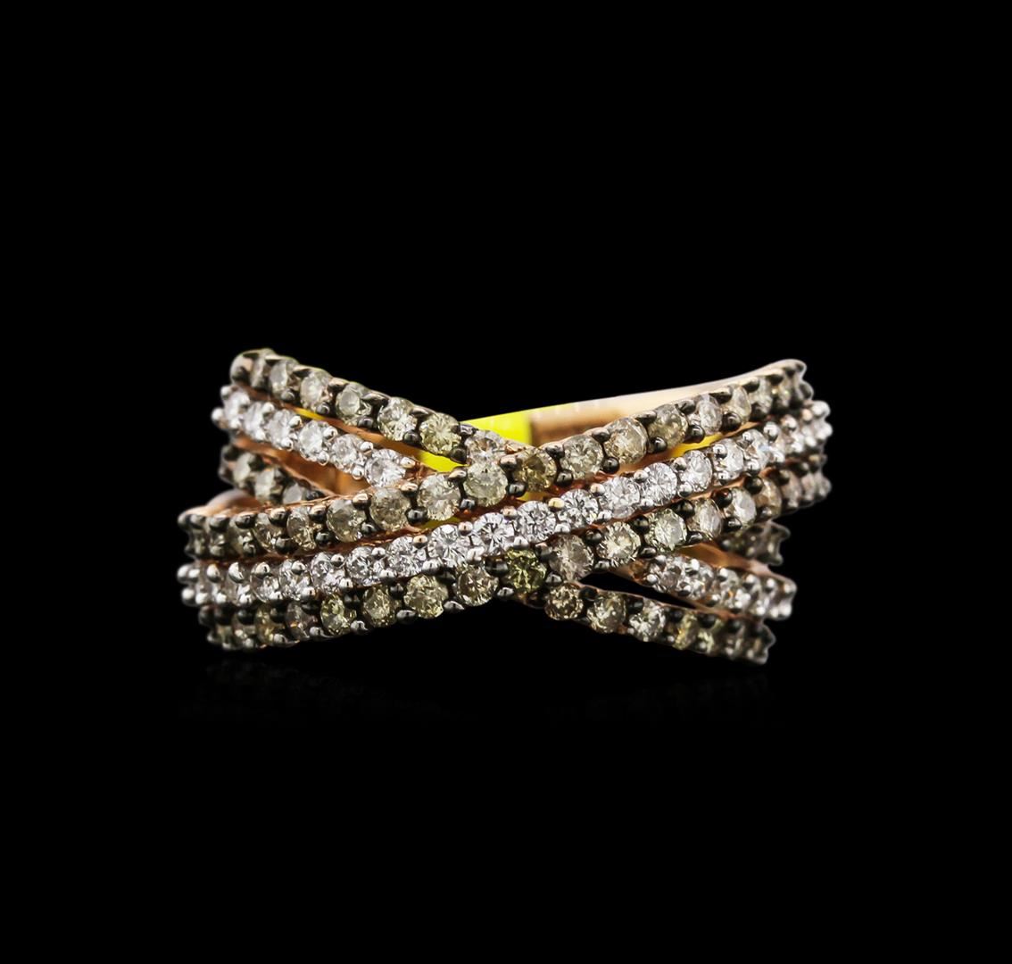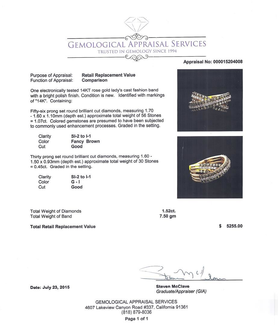One electronically tested 14KT rose gold lady's cast fashion band with a bright polish finish. Condition is new. Identified with markings of "14KT". Containing: Fifty-six prong set round brilliant cut diamonds, measuring 1.70 - 1.60 x 1.10mm (depth est.) approximate total weight of 56 Stones = 1.07ct. Colored gemstones are presumed to have been subjected to commonly used enhancement processes. Graded in the setting. Clarity: SI-2 to I-1. Color: G - I. Cut: Good. Total Weight of Diamonds: 1.52ct. Total Weight of Band: 7.50. Gemological Appraisal Services at $5,255.00.