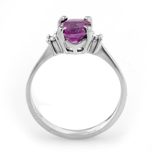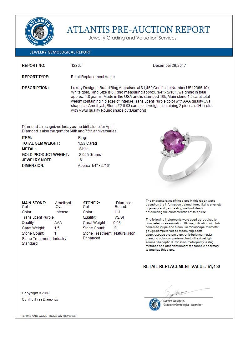 REF-22Y2K -12365 ---- 1.53 CTW Amethyst & Diamond Ring 10K White Gold ---- Luxury Designer Brand Ring Appraised at $1,450 Certificate Number US12365 10k White gold, Ring Size is 6, Ring measuring approx. 1/4" x 5/16" , weighing in total approx. 1.8 grams. Made in the USA and is stamped 10k, Main stone 1.5 carat total weight containing 1 pieces of Intense Translucent Purple color with AAA quality Oval shape cut Amethyst , Stone #2 0.03 carat total weight containing 2 pieces of H-I color with VS/SI quality Round shape cut Diamond