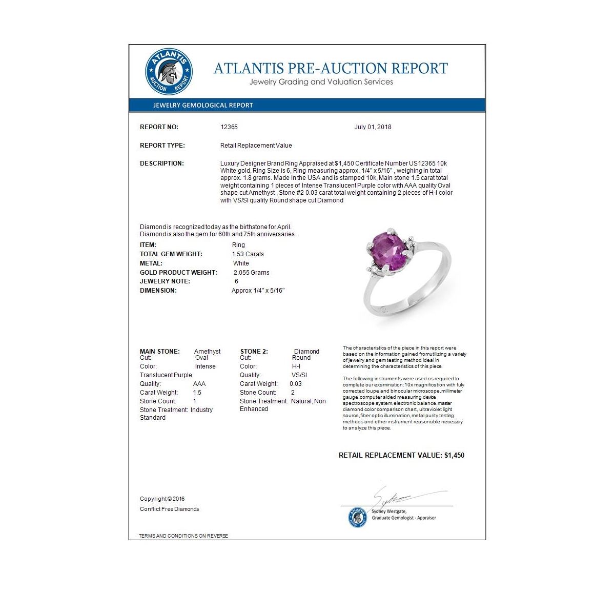 REF-22Y2K -12365 ---- 1.53 CTW Amethyst & Diamond Ring 10K White Gold ---- Luxury Designer Brand Ring Appraised at $1,450 Certificate Number US12365 10k White gold, Ring Size is 6, Ring measuring approx. 1/4" x 5/16" , weighing in total approx. 1.8 grams. Made in the USA and is stamped 10k, Main stone 1.5 carat total weight containing 1 pieces of Intense Translucent Purple color with AAA quality Oval shape cut Amethyst , Stone #2 0.03 carat total weight containing 2 pieces of H-I color with VS/SI quality Round shape cut Diamond