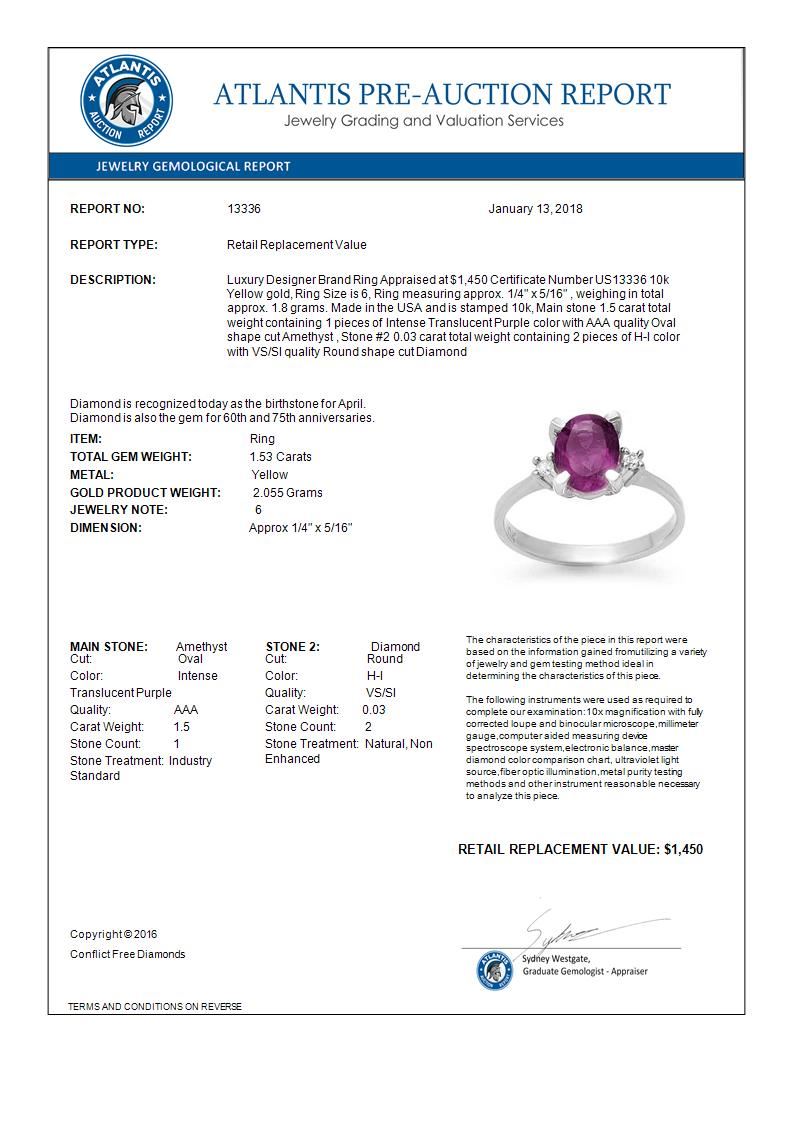 REF-22F2N -13336 ---- 1.53 CTW Amethyst & Diamond Ring 10K Yellow Gold ---- Luxury Designer Brand Ring Appraised at $1,450 Certificate Number US13336 10k Yellow gold, Ring Size is 6, Ring measuring approx. 1/4" x 5/16" , weighing in total approx. 1.8 grams. Made in the USA and is stamped 10k, Main stone 1.5 carat total weight containing 1 pieces of Intense Translucent Purple color with AAA quality Oval shape cut Amethyst , Stone #2 0.03 carat total weight containing 2 pieces of H-I color with VS/SI quality Round shape cut Diamond