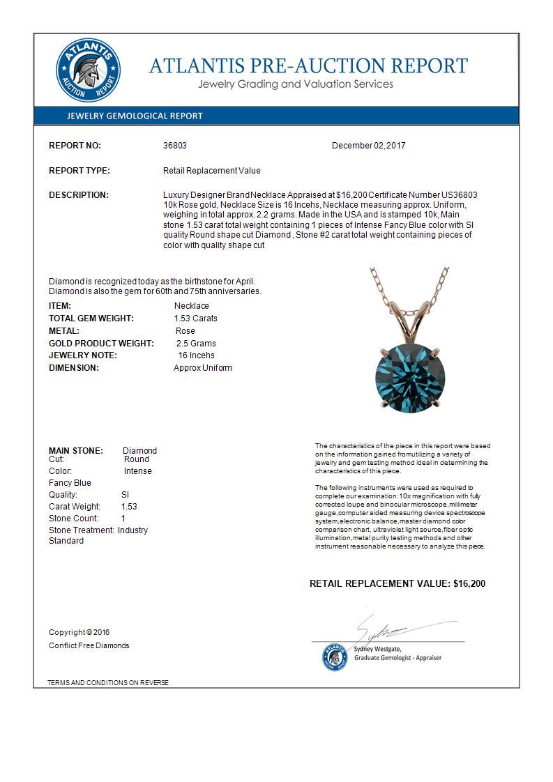 REF-202T5M -36803 ---- 1.53 CTW Certified Intense Blue SI Diamond Solitaire Necklace 10K Rose Gold ---- Luxury Designer Brand Necklace Appraised at $16,200 Certificate Number US36803 10k Rose gold, Necklace Size is 16 Incehs, Necklace measuring approx. Uniform, weighing in total approx. 2.2 grams. Made in the USA and is stamped 10k, Main stone 1.53 carat total weight containing 1 pieces of Intense Fancy Blue color with SI quality Round shape cut Diamond , Stone #2 carat total weight containing pieces of color with quality shape cut