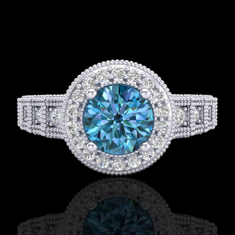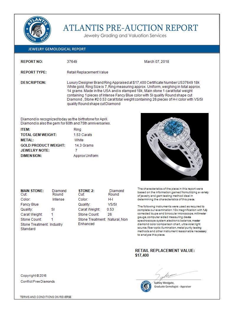 REF-263H6A -37649 ---- 1.53 CTW Fancy Intense Blue Diamond Solitaire Art Deco Ring 18K White Gold ---- Luxury Designer Brand Ring Appraised at $17,400 Certificate Number US37649 18k White gold, Ring Size is 7, Ring measuring approx. Uniform, weighing in total approx. 14 grams. Made in the USA and is stamped 18k, Main stone 1 carat total weight containing 1 pieces of Intense Fancy Blue color with SI quality Round shape cut Diamond , Stone #2 0.53 carat total weight containing 26 pieces of H-I color with VS/SI quality Round shape cut Diamond