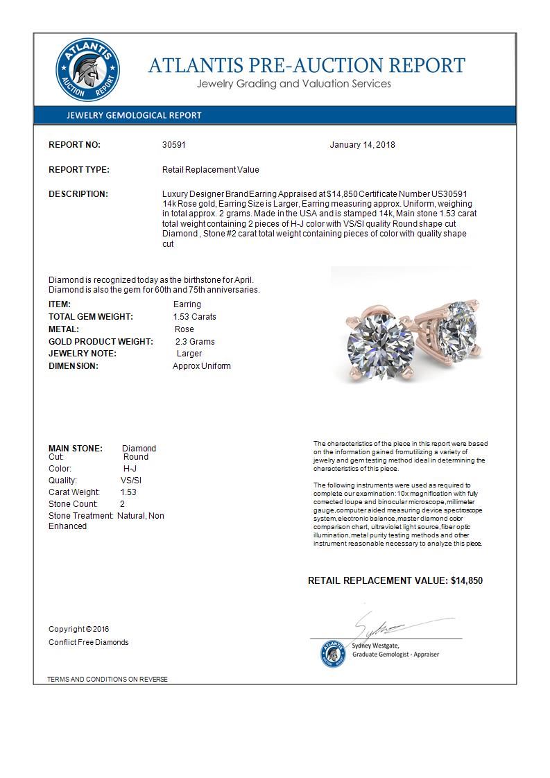 REF-247H6A -30591 ---- 1.53 CTW VS/SI Diamond Stud Designer Earrings 14K Rose Gold ---- Luxury Designer Brand Earring Appraised at $14,850 Certificate Number US30591 14k Rose gold, Earring Size is Larger, Earring measuring approx. Uniform, weighing in total approx. 2 grams. Made in the USA and is stamped 14k, Main stone 1.53 carat total weight containing 2 pieces of H-J color with VS/SI quality Round shape cut Diamond , Stone #2 carat total weight containing pieces of color with quality shape cut
