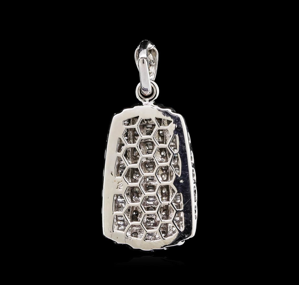 One electronically tested 18KT white gold ladies cast & assembled diamond pendant/enhancer. The pendant/enhancer features a stylized diamond set scalloped design, completed by a diamond set snap-locking bail. Bright and satin finish. Identified with markings of "18K". Condition is good. Containing: Seventy-Eight channel set baguette cut diamonds, measuring from 1.50 x 1.00 x 0.70mm (depth est.) to 1.70 x 1.20 x 0.84mm (depth est.) approximate total weight of 78 Stones = 1.06ct. Graded in the setting. Clarity: VS-1 to SI-1. Color: G - I Four bead set round brilliant cut diamonds, measuring 1.60 - 1.60 x 0.96mm (depth est.) approximate total weight of 4 Stones = 0.06ct. Graded in the setting. Clarity: VS-1 to VS-2. Color: G - H Fifty-Seven bead set round brilliant cut diamonds, measuring 1.20 - 1.10 x 0.69mm (depth est.) approximate total weight of 57 Stones = 0.41ct. Graded in the setting. Clarity: VS-1 to SI-1. Color: G - I. Total Weight of Diamonds 1.53ct. Total Weight of Pendant/Enhancer 8.04gm. AIG Appraised at $6,680.00.