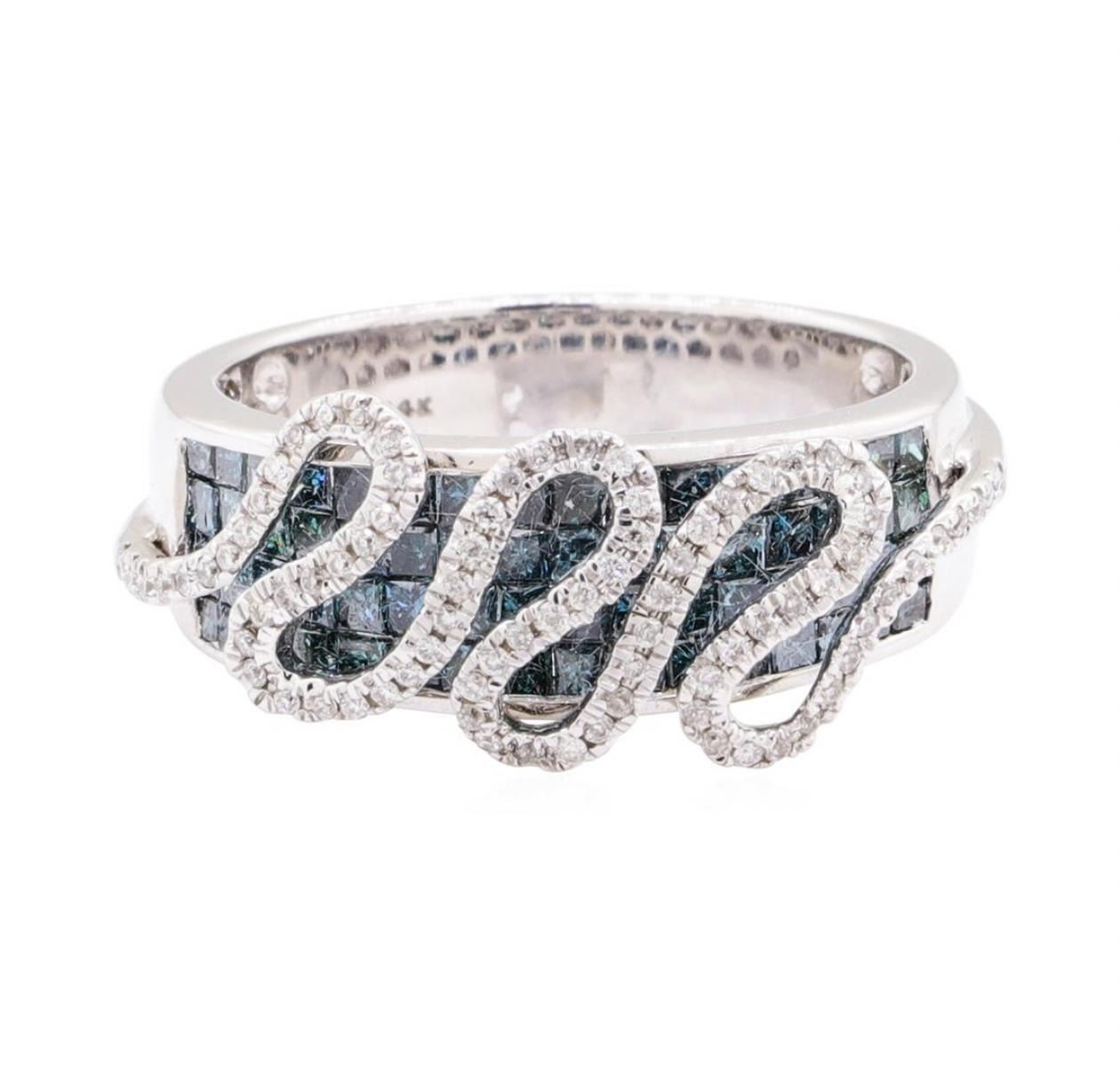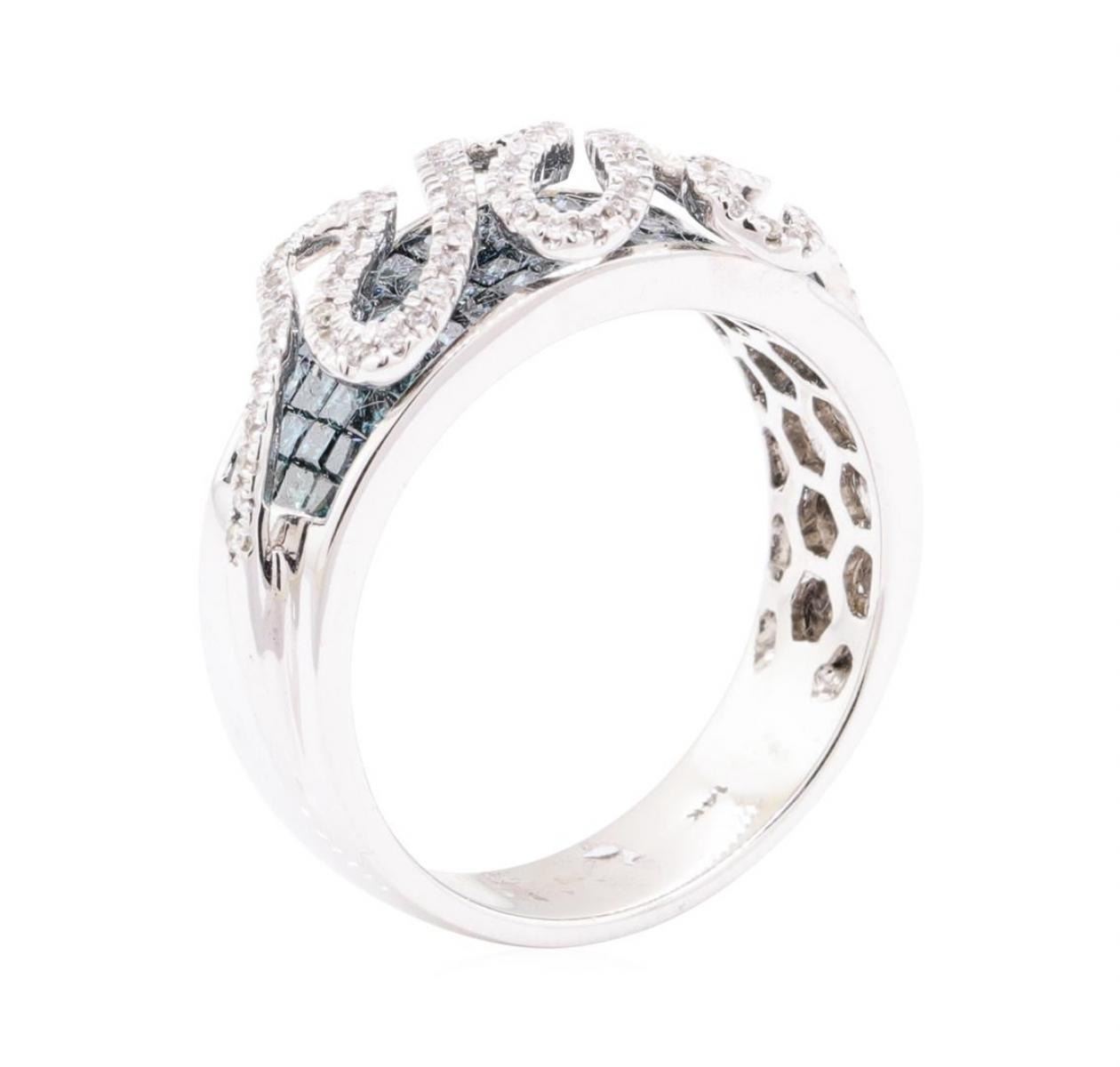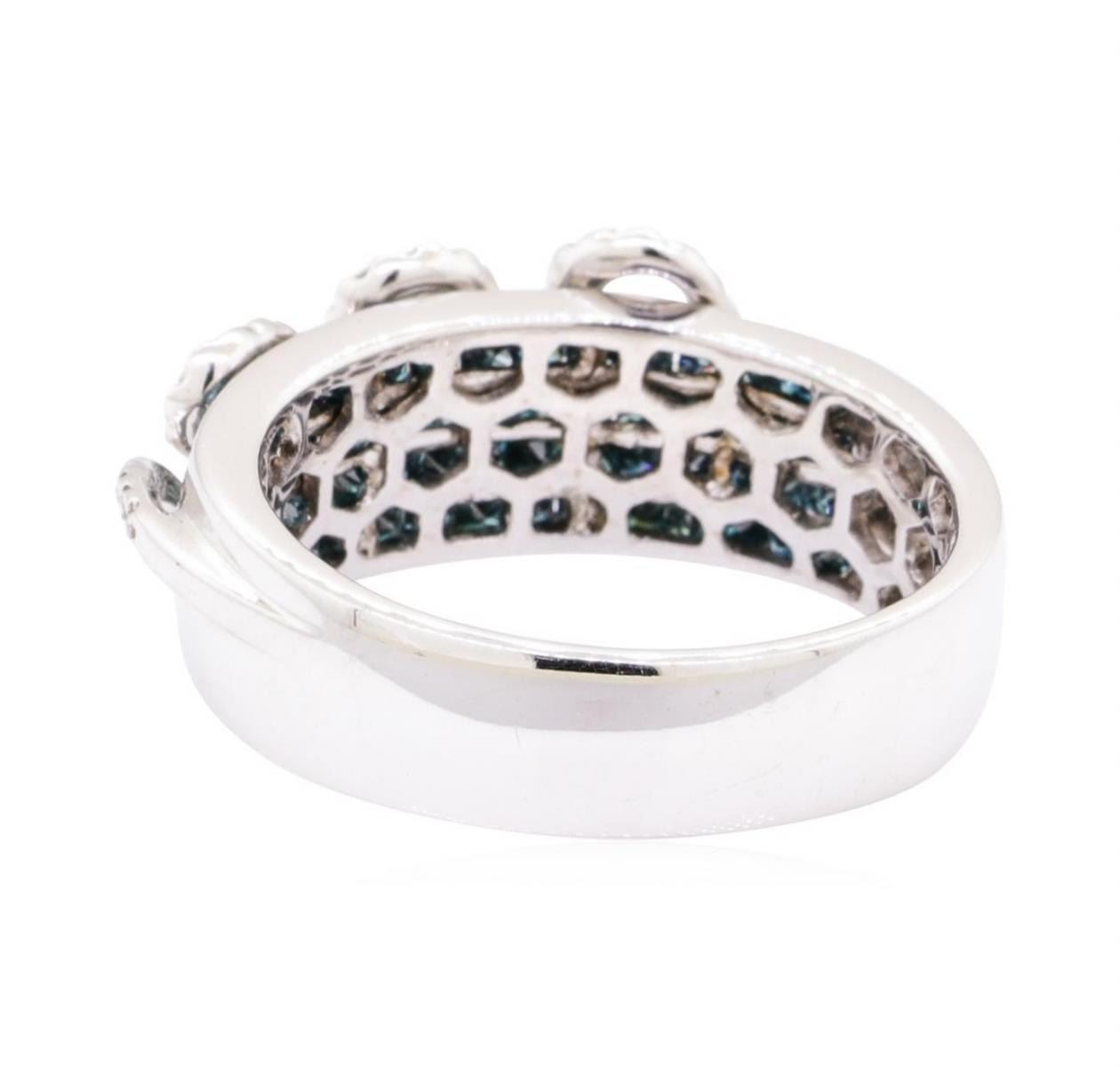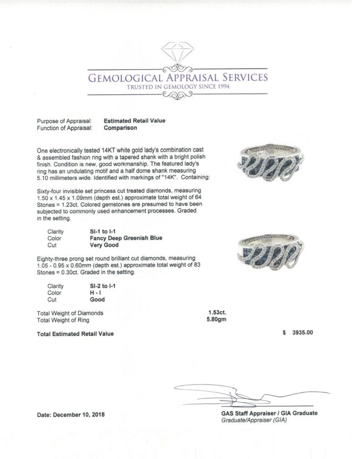 One electronically tested 14KT white gold lady's combination cast & assembled fashion ring with a tapered shank with a bright polish finish. The featured lady's ring has an undulating motif and a half dome shank measuring 5.10 millimeters wide. Identified with markings of '14K'. Condition is new, good workmanship. Containing: Sixty-Four invisible set princess cut treated diamonds, measuring 1.50 x 1.45 x 1.09mm (depth est.) approximate total weight of 64 Stones = 1.23ct. Colored gemstones are presumed to have been subjected to commonly used enhancement processes. Graded in the setting. Color Fancy Deep Greenish Blue Clarity SI-1 to I-1 Cut Very Good Eighty-Three prong set round brilliant cut diamonds, measuring 1.05 - 0.95 x 0.60mm (depth est.) approximate total weight of 83 Stones = 0.30ct. Graded in the setting. Color H - I Clarity SI-2 to I-1 Cut Good. Total Weight of Diamonds 1.53ct.. Total Weight of Ring 5.80gm GAS Appraised at $3935.00. GAS Appraised.