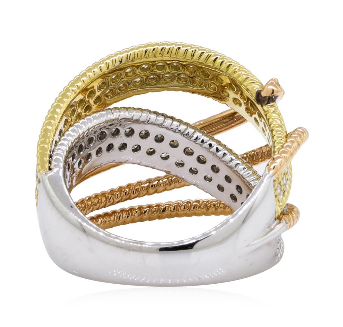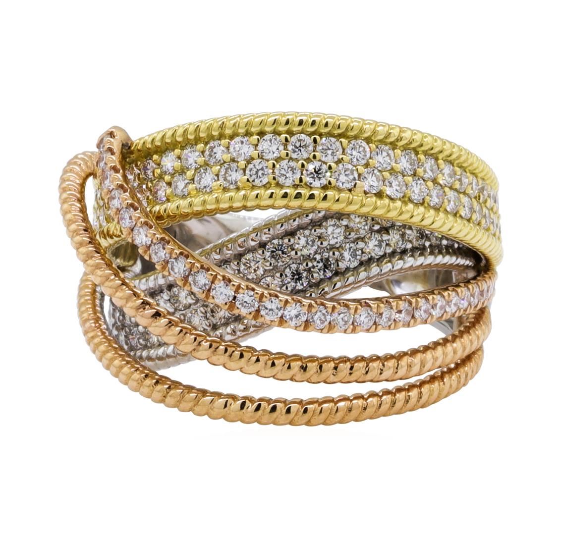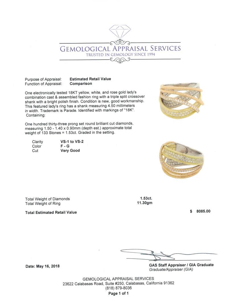 One electronically tested 18KT yellow, white, and rose gold lady's combination cast & assembled fashion ring with a triple split crossover shank with a bright polish finish. This featured lady's ring has a shank measuring 4.50 millimeters in width. Trademark is Parade. Identified with markings of '18K'. Condition is new, good workmanship. Containing: One Hundred Thirty-Three prong set round brilliant cut diamonds, measuring 1.50 - 1.40 x 0.90mm (depth est.) approximate total weight of 133 Stones = 1.53ct. Graded in the setting. Color F - G Clarity VS-1 to VS-2 Cut Very Good. Total Weight of Diamonds 1.53ct.. Total Weight of Ring 11.30gm GAS Appraised at $8085.00. GAS Appraised.