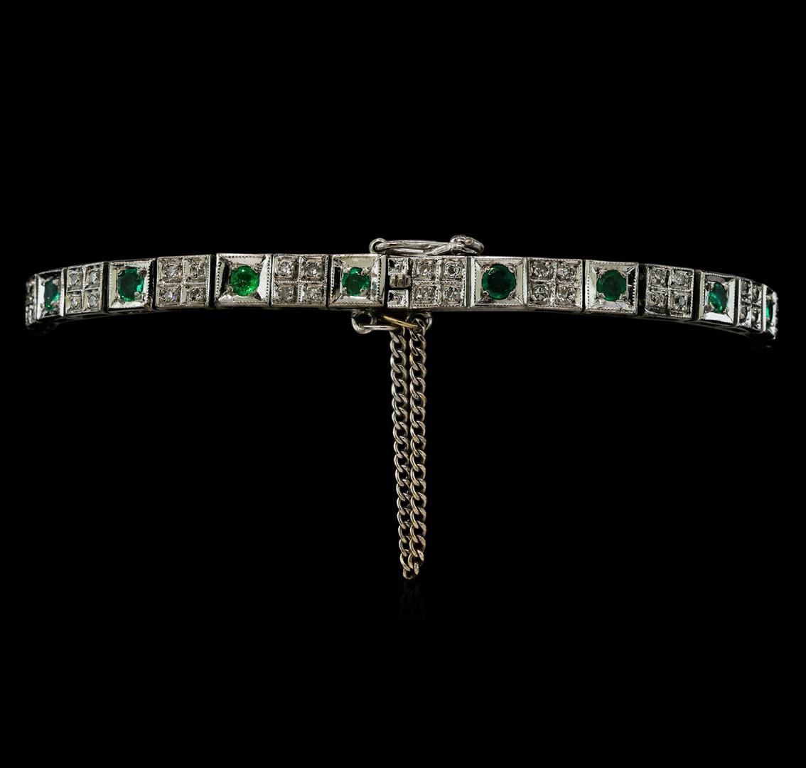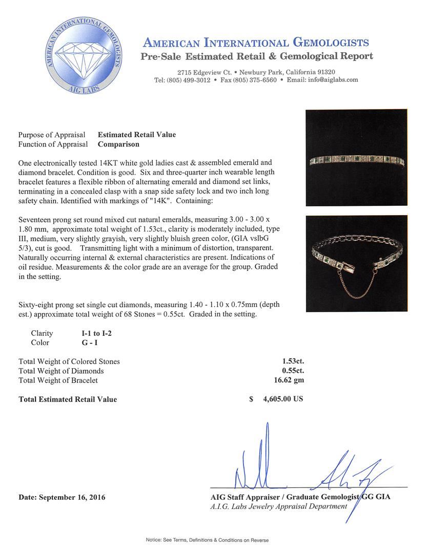 One electronically tested 14KT white gold ladies cast & assembled emerald and diamond bracelet. Six and three-quarter inch wearable length bracelet features a flexible ribbon of alternating emerald and diamond set links, terminating in a concealed clasp with a snap side safety lock and two inch long safety chain. Identified with markings of '14K'. Condition is good. Containing: Seventeen prong set round mixed cut natural emeralds, measuring 3.00 - 3.00 x 1.80 mm, approximate total weight of 1.53ct., clarity is moderately included, type III, medium, very slightly grayish, very slightly bluish green color, (GIA vslbG 5/3), cut is good. Transmitting light with a minimum of distortion, transparent. Naturally occurring internal & external characteristics are present. Indications of oil residue. Measurements & the color grade are an average for the group. Graded in the setting. Sixty-Eight prong set single cut diamonds, measuring 1.40 - 1.10 x 0.75mm (depth est.) approximate total weight of 68 Stones = 0.55ct. Graded in the setting. Clarity I-1 to I-2. Color: G - I. Total Weight of Colored Stones 1.53ct.. Total Weight of Diamonds 0.55ct.. Total Weight of Bracelet 16.62gm. AIG Appraised at $4,605.00.