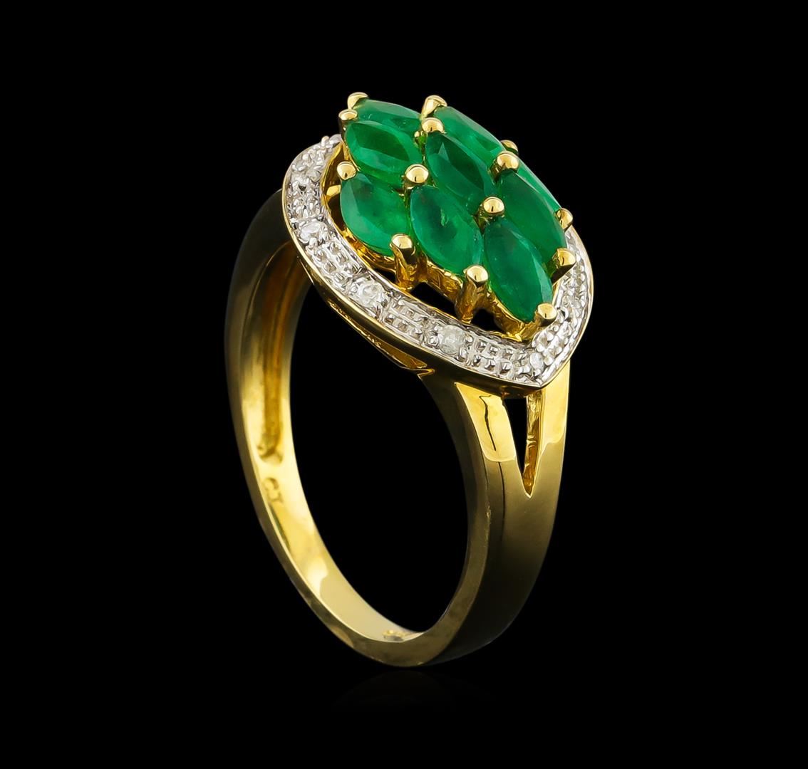One ring featuring: 10KT yellow gold weighing 3.04 grams containing nine emeralds with a total weight of 1.53ct and 10 round diamonds with a total weight of 0.08ct.